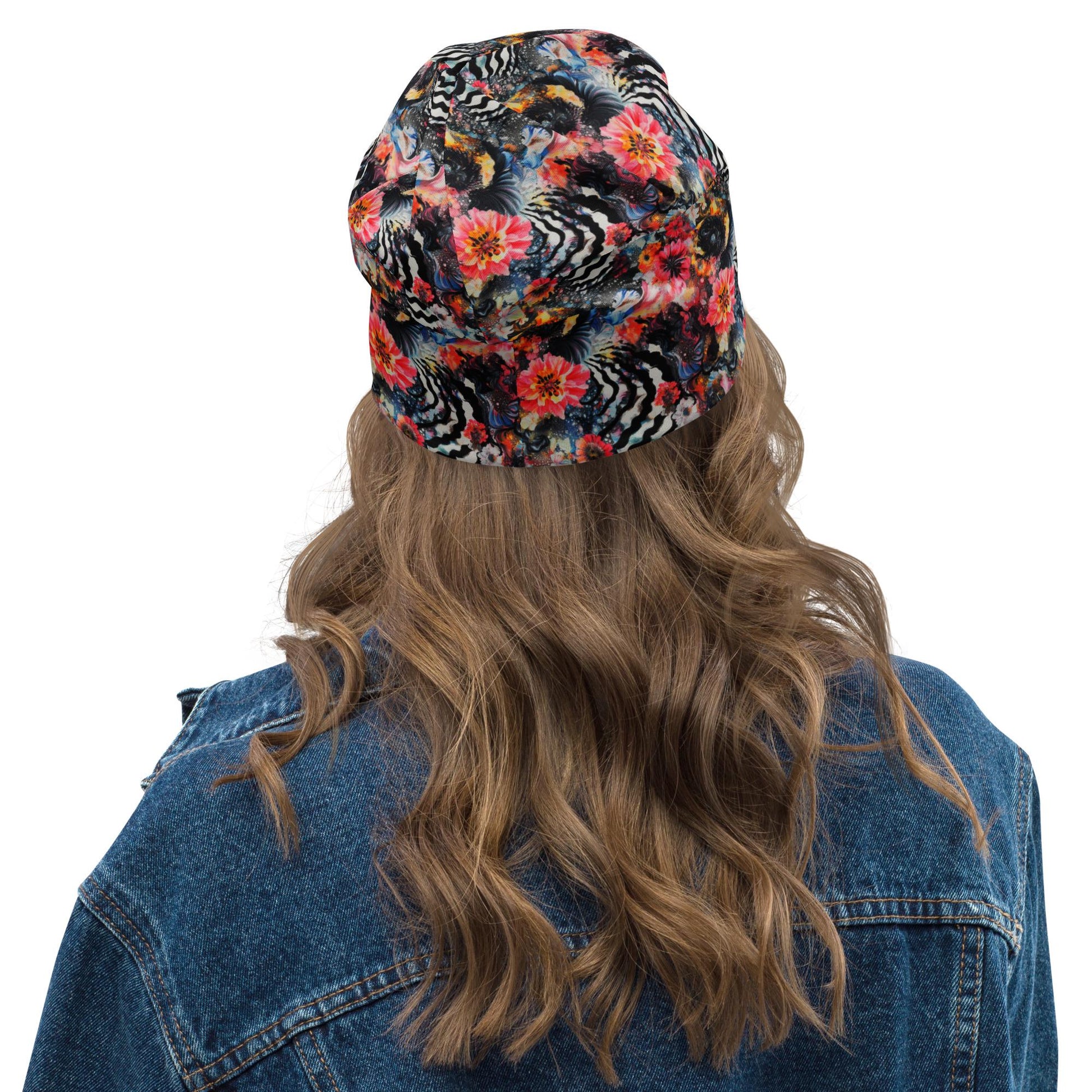 This beanie features an electrifying abstract floral design with sweeping ink swirls, vibrant bursts of pink, coral, yellow, and blue, and striking black ripple accents. The high-energy composition blends expressive fluid art with bold botanical elements, creating a truly eye-catching wearable artwork perfect for artistic fashion lovers.