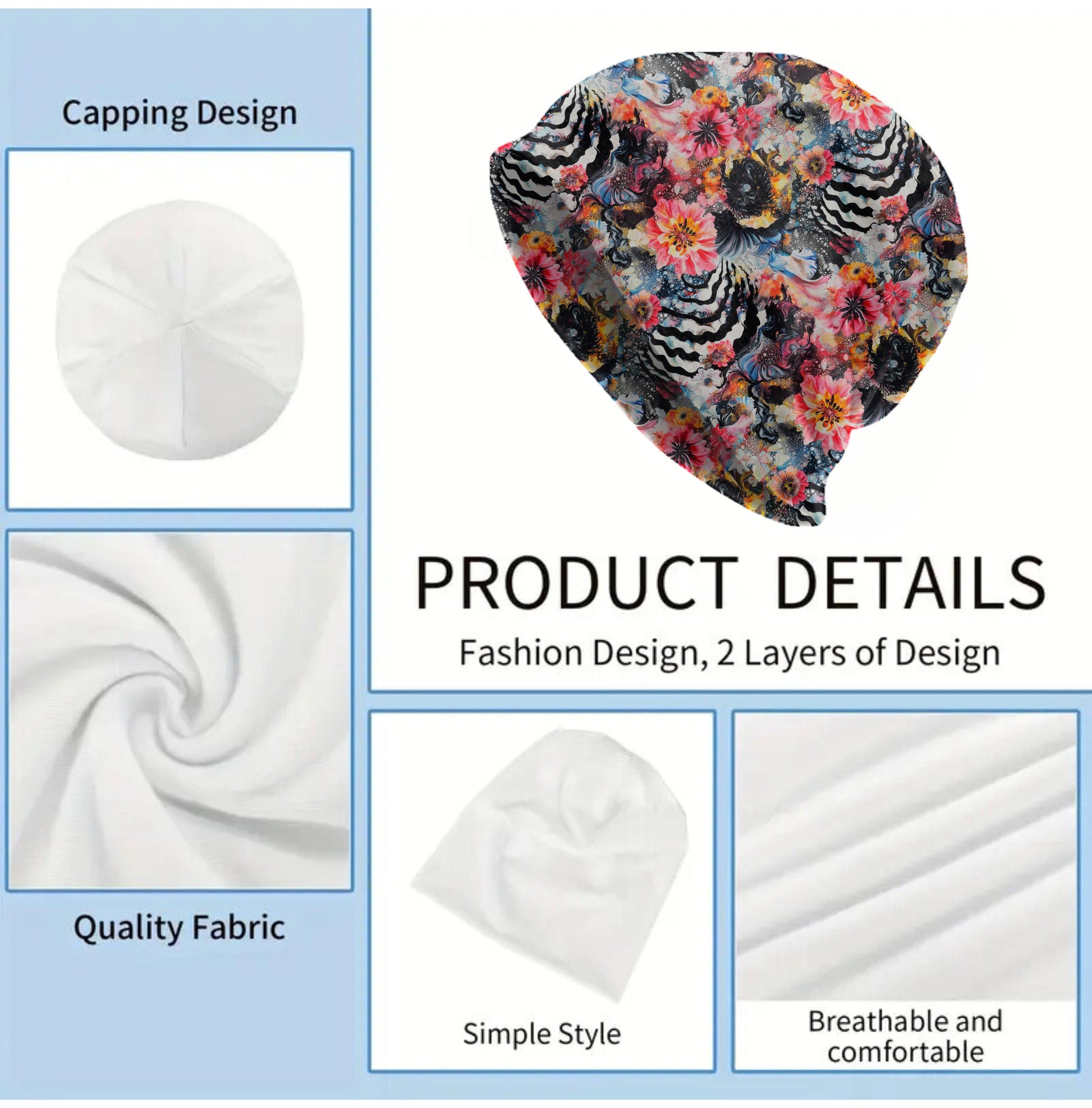 The hat is soft, lightweight, thin and stretchy, offering breathable comfort without bulk. It is not a thick or chunky knit beanie. Instead, it has a smooth, flexible drape suitable for year-round wear. The artwork is created with high-quality sublimation printing, permanently infused into the fabric so it will not peel or crack.