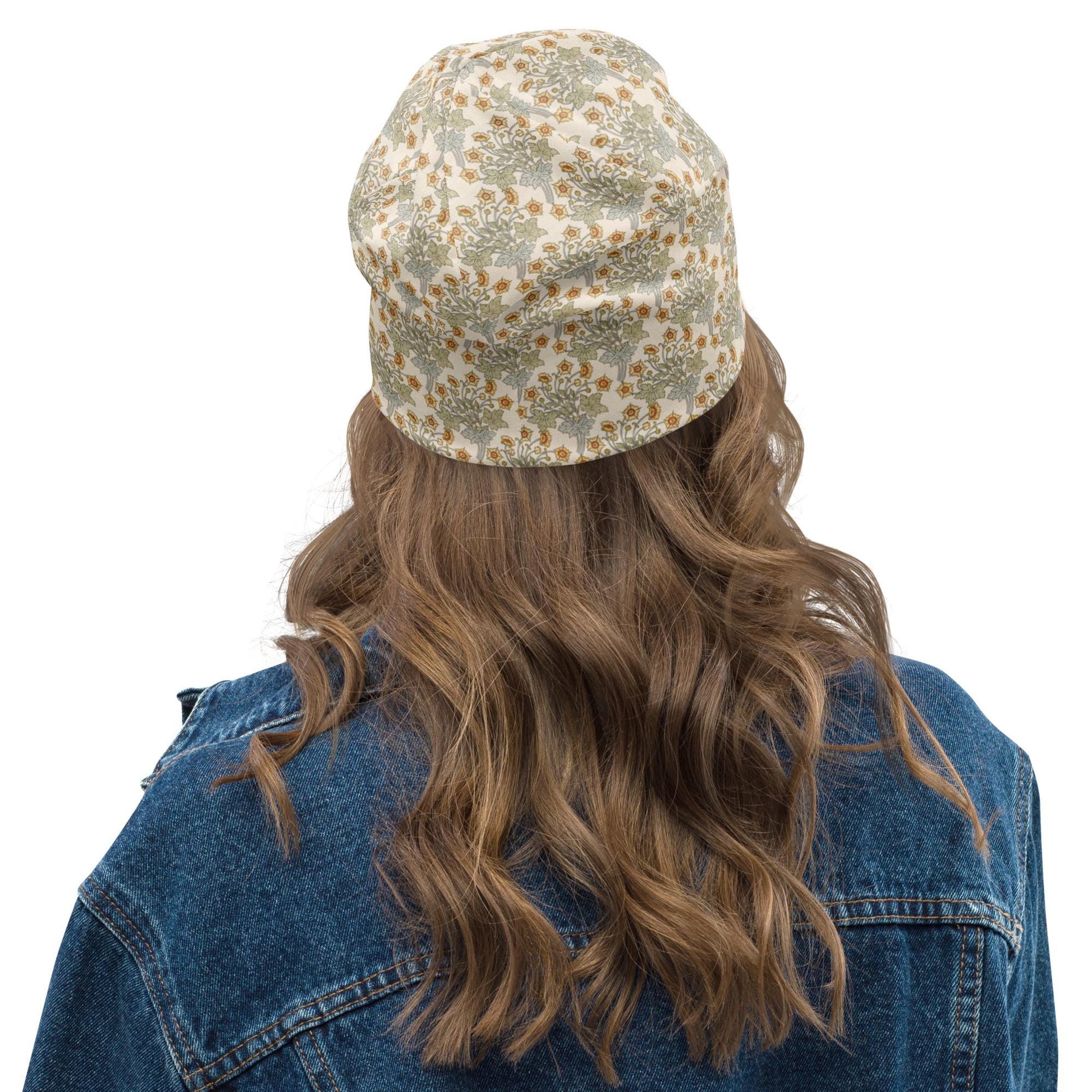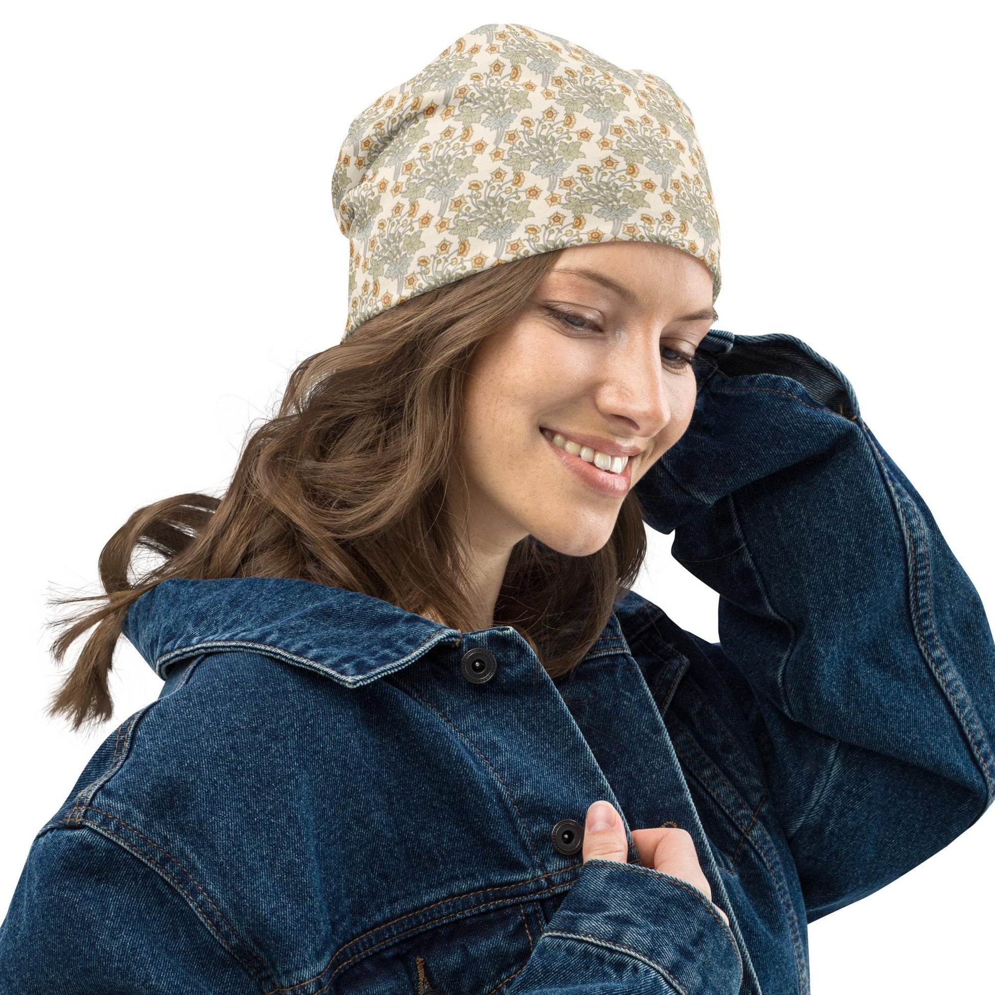 This Art Nouveau buttercup beanie features a graceful floral pattern inspired by the works of Maurice Pillard-Verneuil, blending soft greens, golds, and cream tones in a delicate repeat motif. A refined vintage botanical accessory with timeless romantic charm.