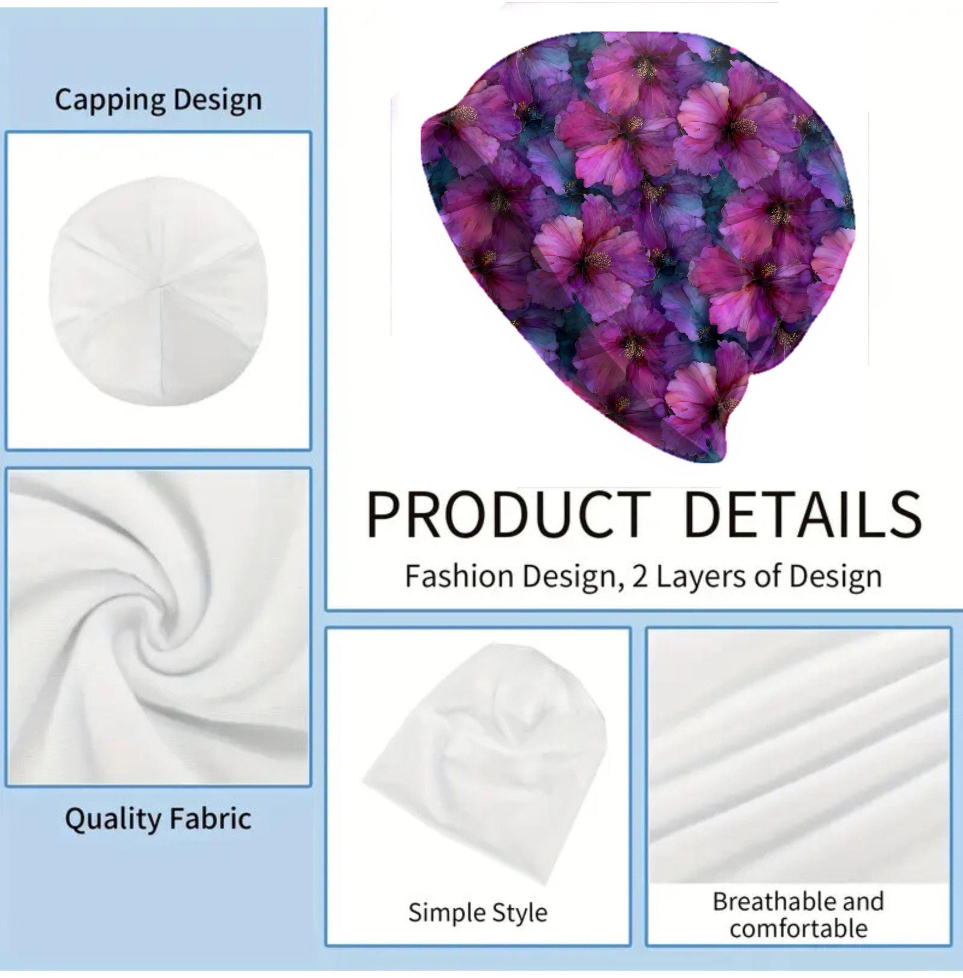 The fabric is soft, breathable, and thin and stretchy, making it comfortable for everyday wear without bulk. This is not a thick or chunky knit beanie. The detailed floral artwork is applied using high-quality sublimation, infusing the colors permanently into the fibers for a smooth, long-lasting print.