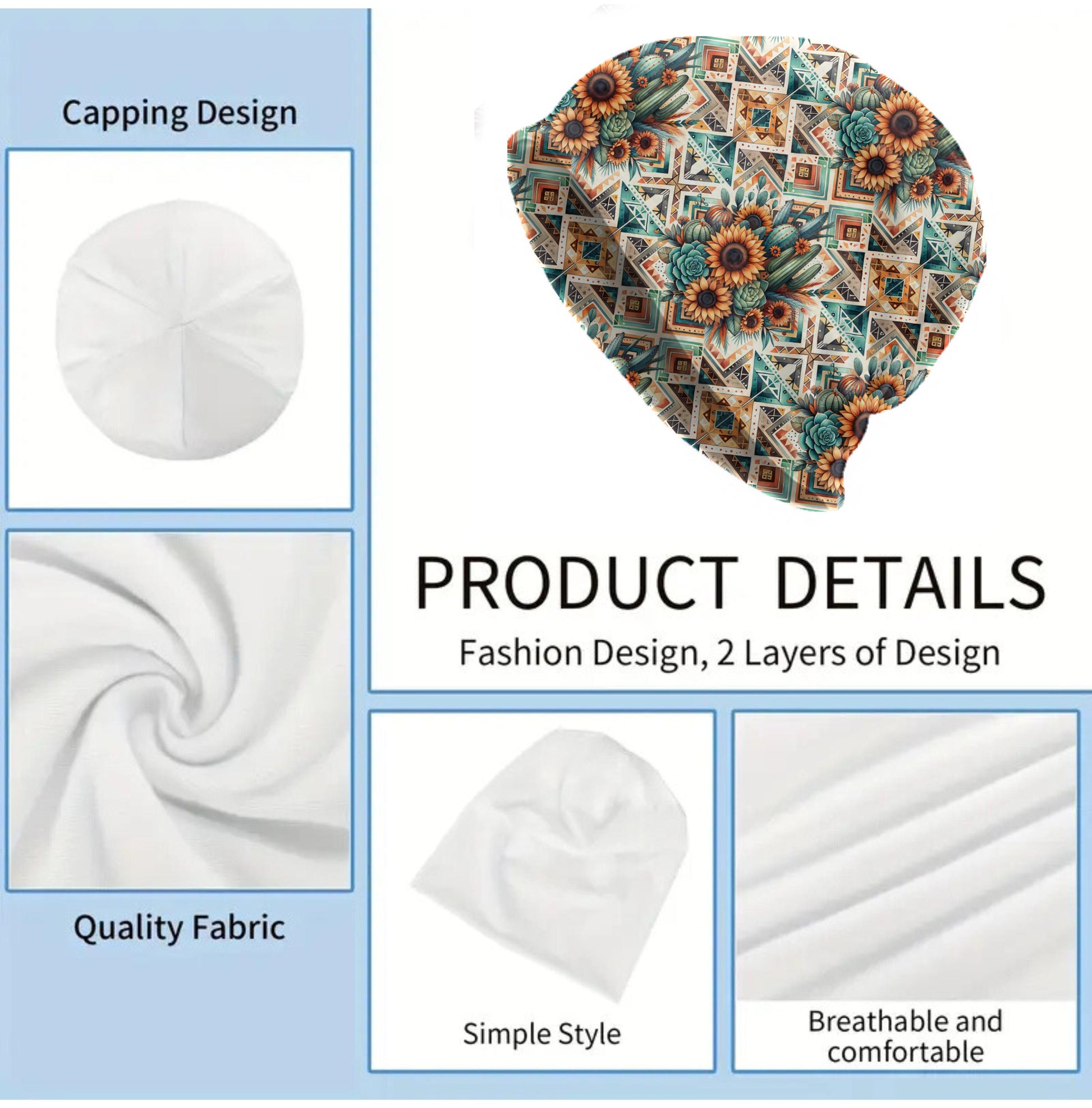 Boho Aztec Sunflower Slouchy Beanie – Thin Stretchy Lightweight Skull Cap for Men and Women with Cactus & Southwest Florals