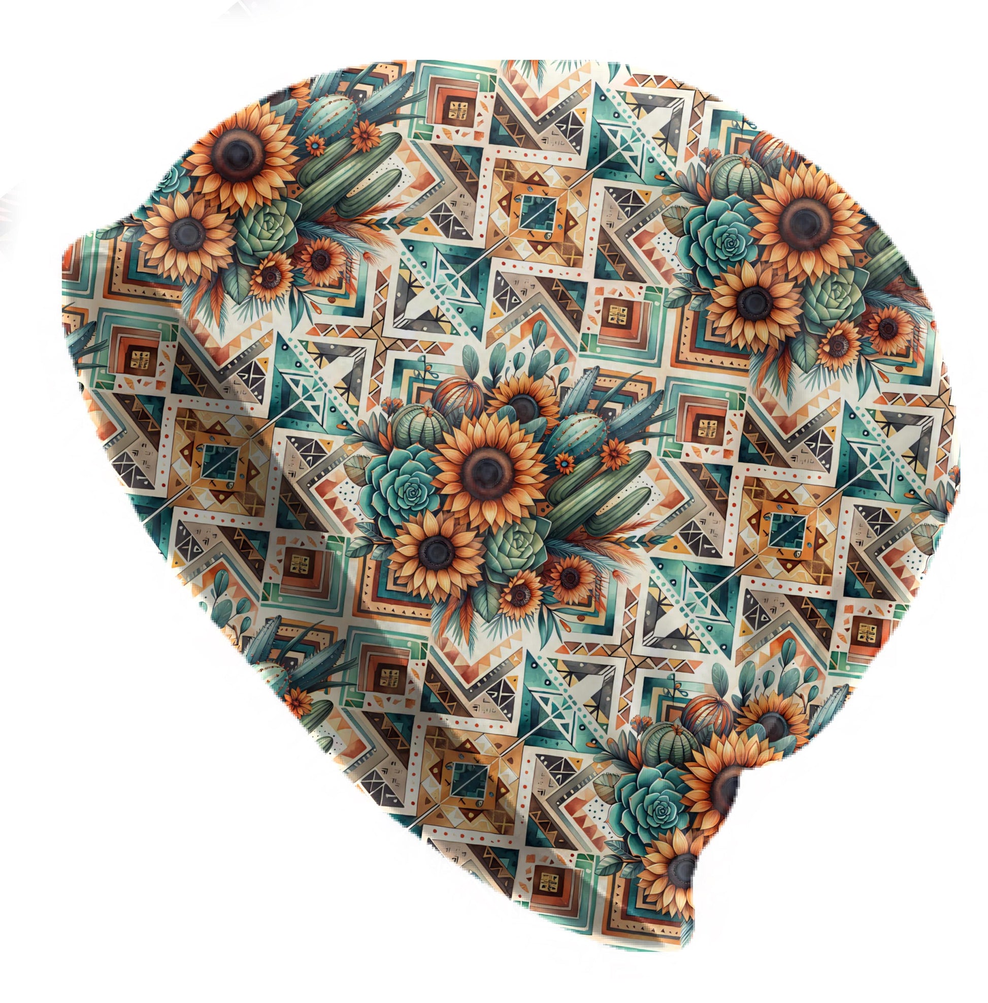 Sunflowers bloom against painted cacti and teal succulents, all framed by warm Aztec lines in terracotta, sand, and turquoise. The pattern feels like desert sunshine meeting boho folk art, bright but soft, with a hand-illustrated look that flows smoothly across the fabric.