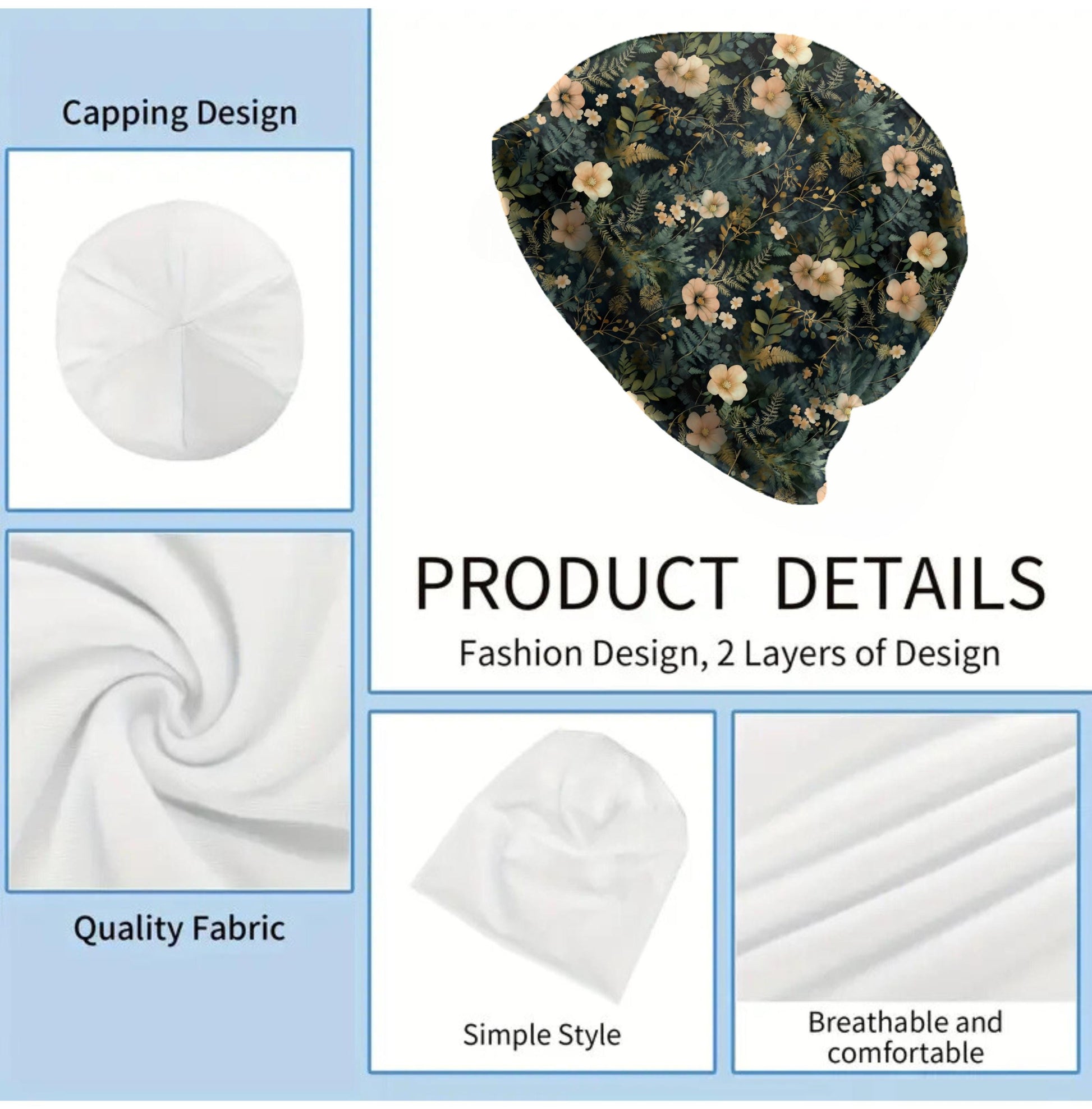 Designed for men and women, this slouchy bonnet-style beanie adds an elegant botanical accent to everyday outfits, cottagecore looks, natural earth-tone wardrobes, and artistic fashion styles.