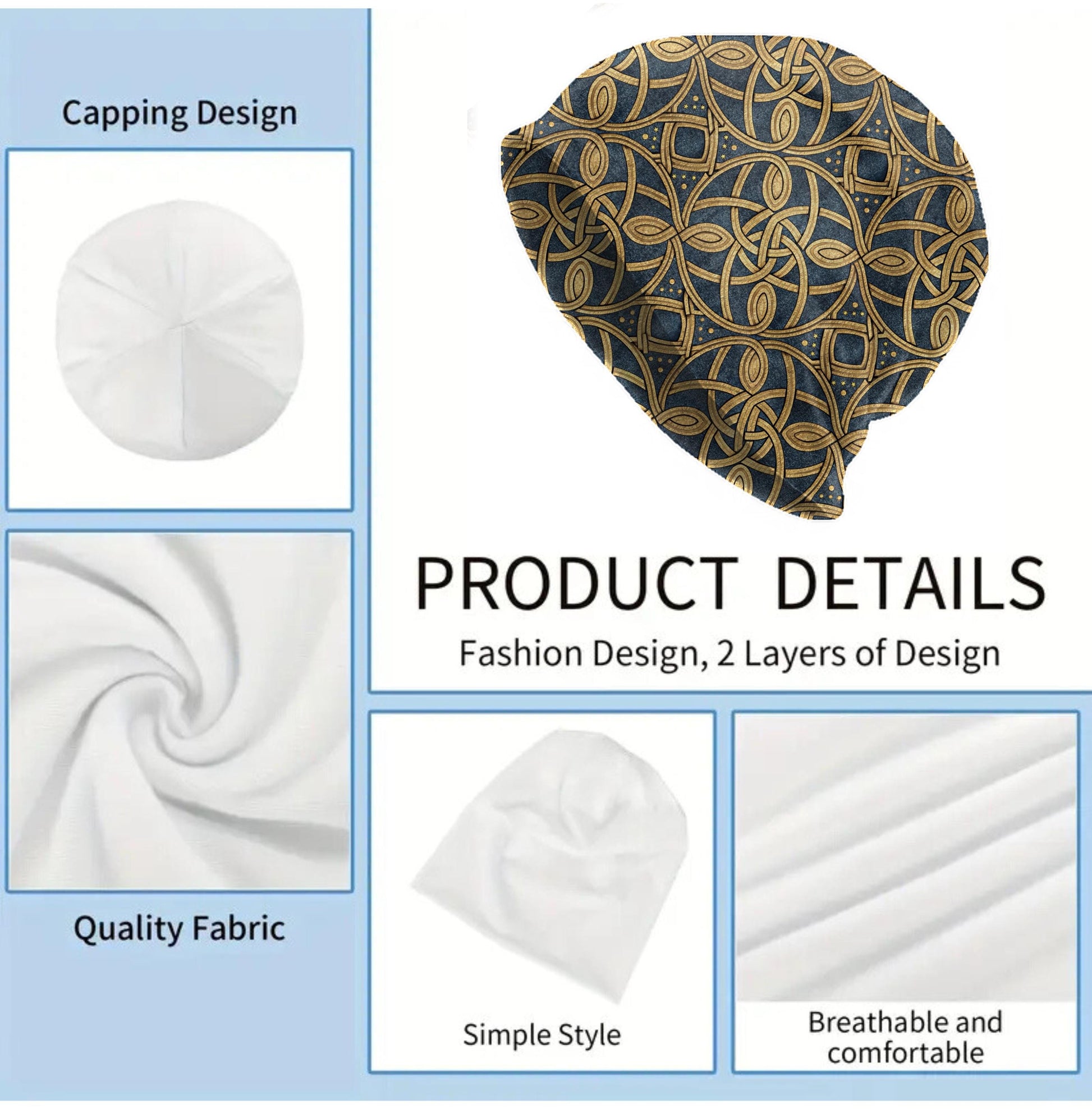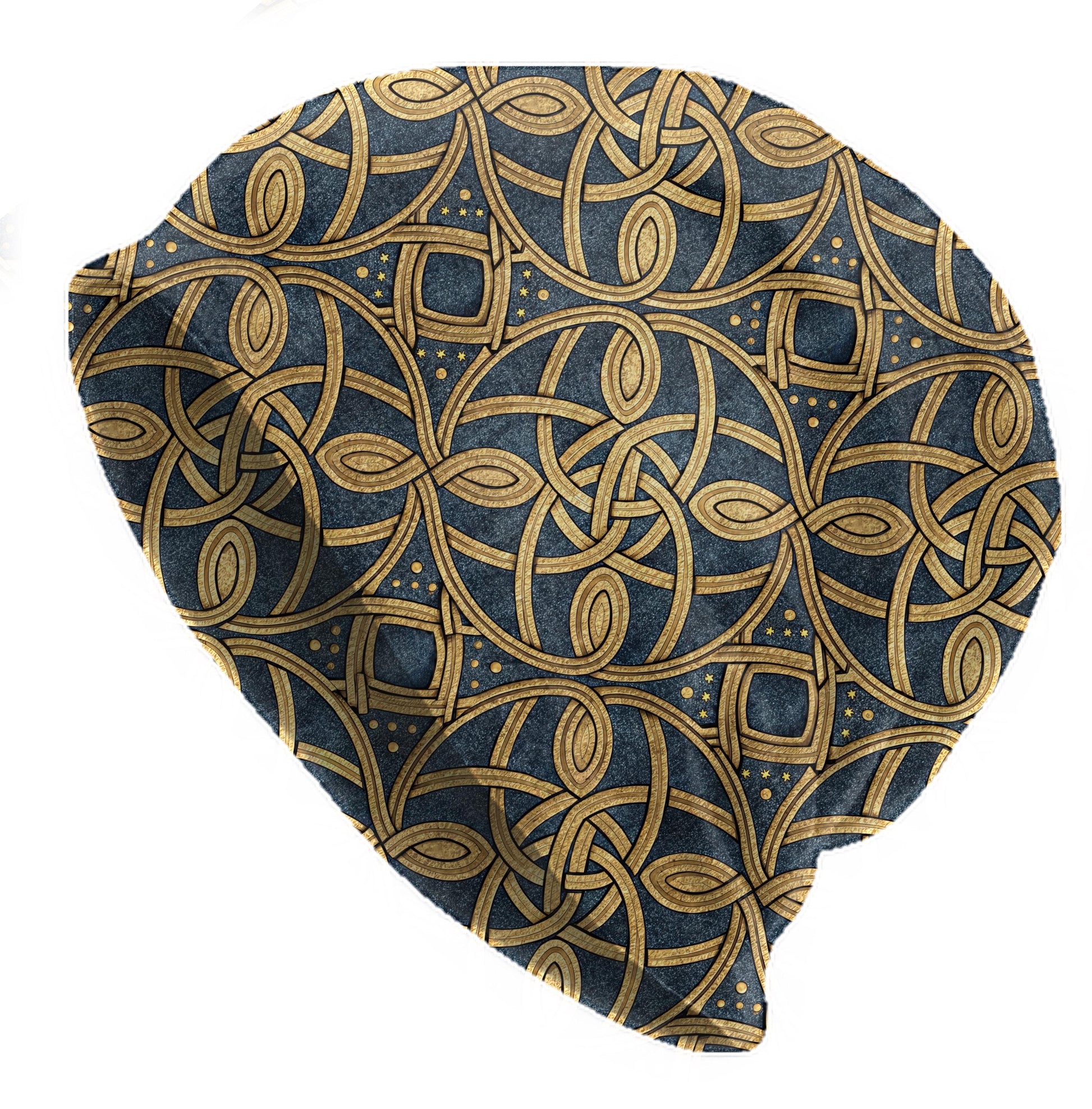 Celtic Knotwork Slouchy Beanie – Thin Stretchy Lightweight Skull Cap for Men and Women in Navy Blue and Gold
