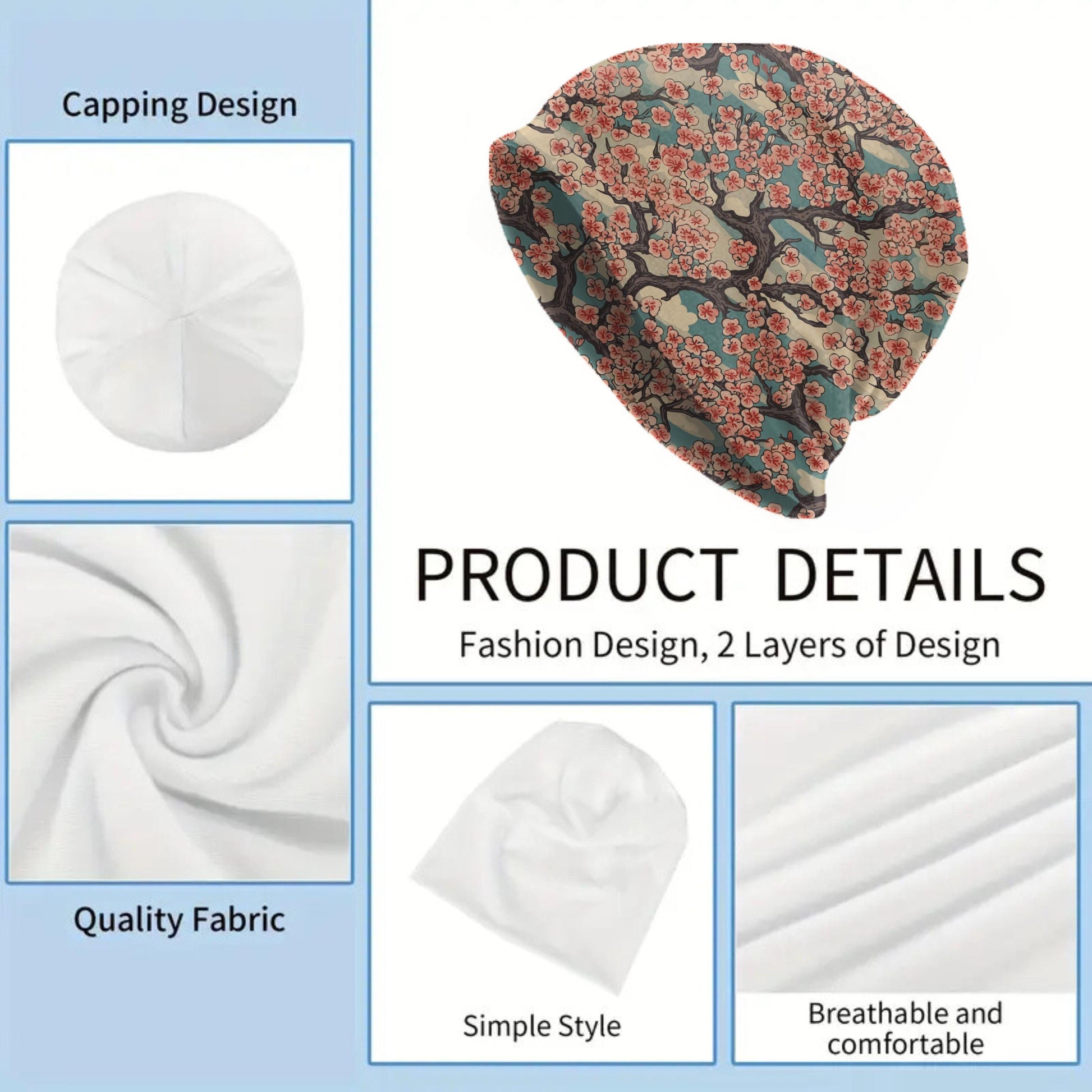 Soft, artistic, and full of spring charm — this Cherry Blossom Beanie features a delicate Japanese-inspired sakura pattern with soft pink blooms on intertwining branches. Set against a soothing teal and cream backdrop, it captures the serene beauty of nature and traditional artistry.