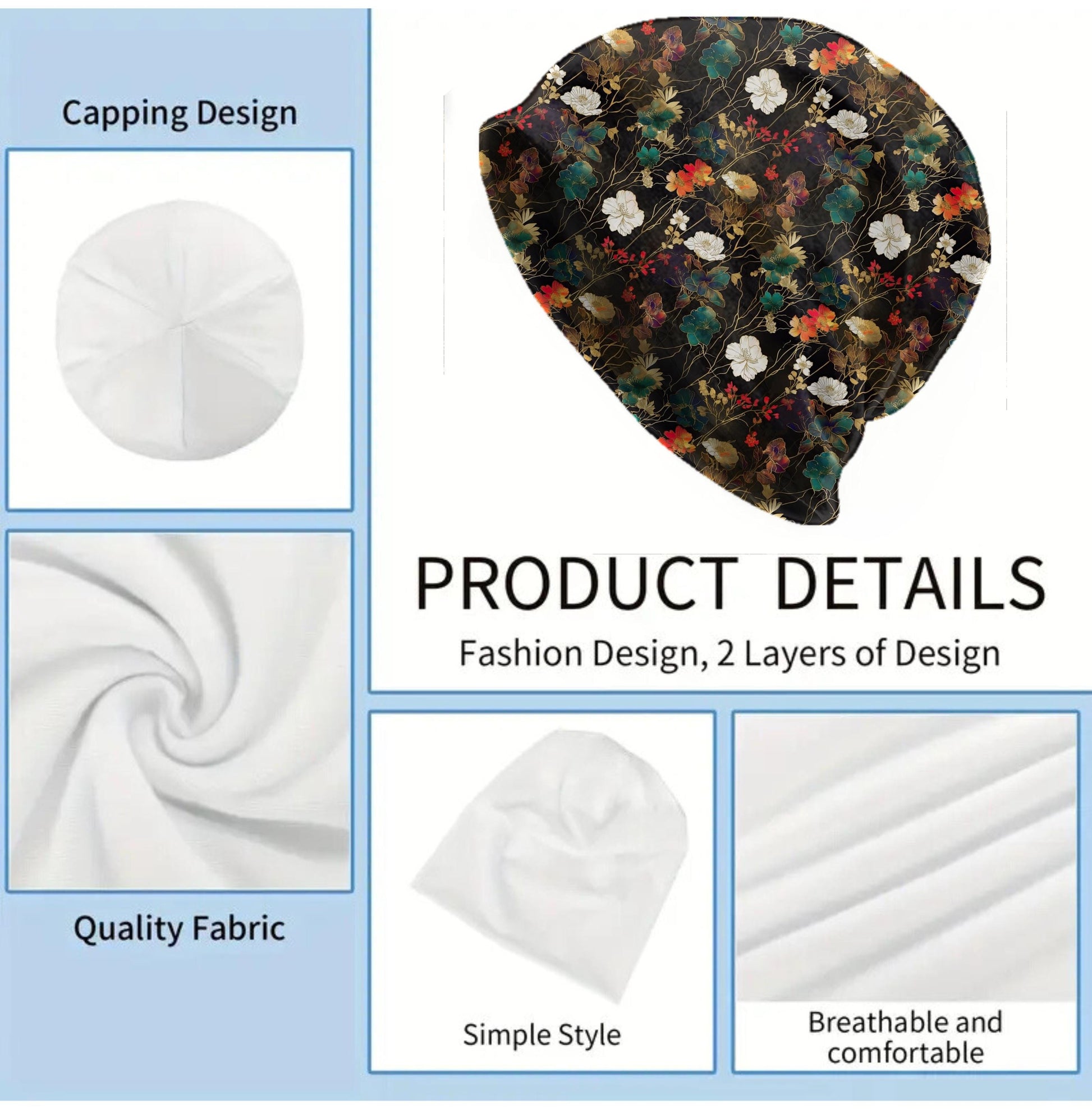 This slouchy beanie features an authentic Chiyogami Japanese floral pattern with gold linework, rich black tones, and layered blossoms in white, teal, and warm autumn reds. A striking textile design blending traditional Japanese floral themes with a refined, modern wearable look.