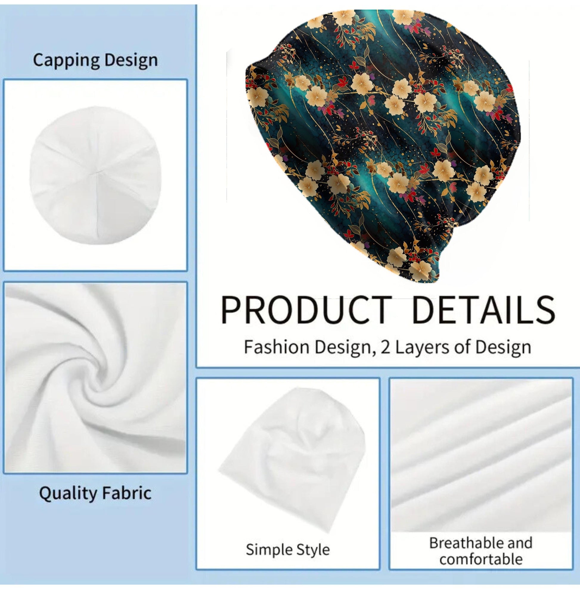Chiyogami Japanese Floral Slouchy Beanie – Gold Blossom Print, Teal & Black Fine Art Flowers Hat, Lightweight Double-Layer Stretch Skull Cap