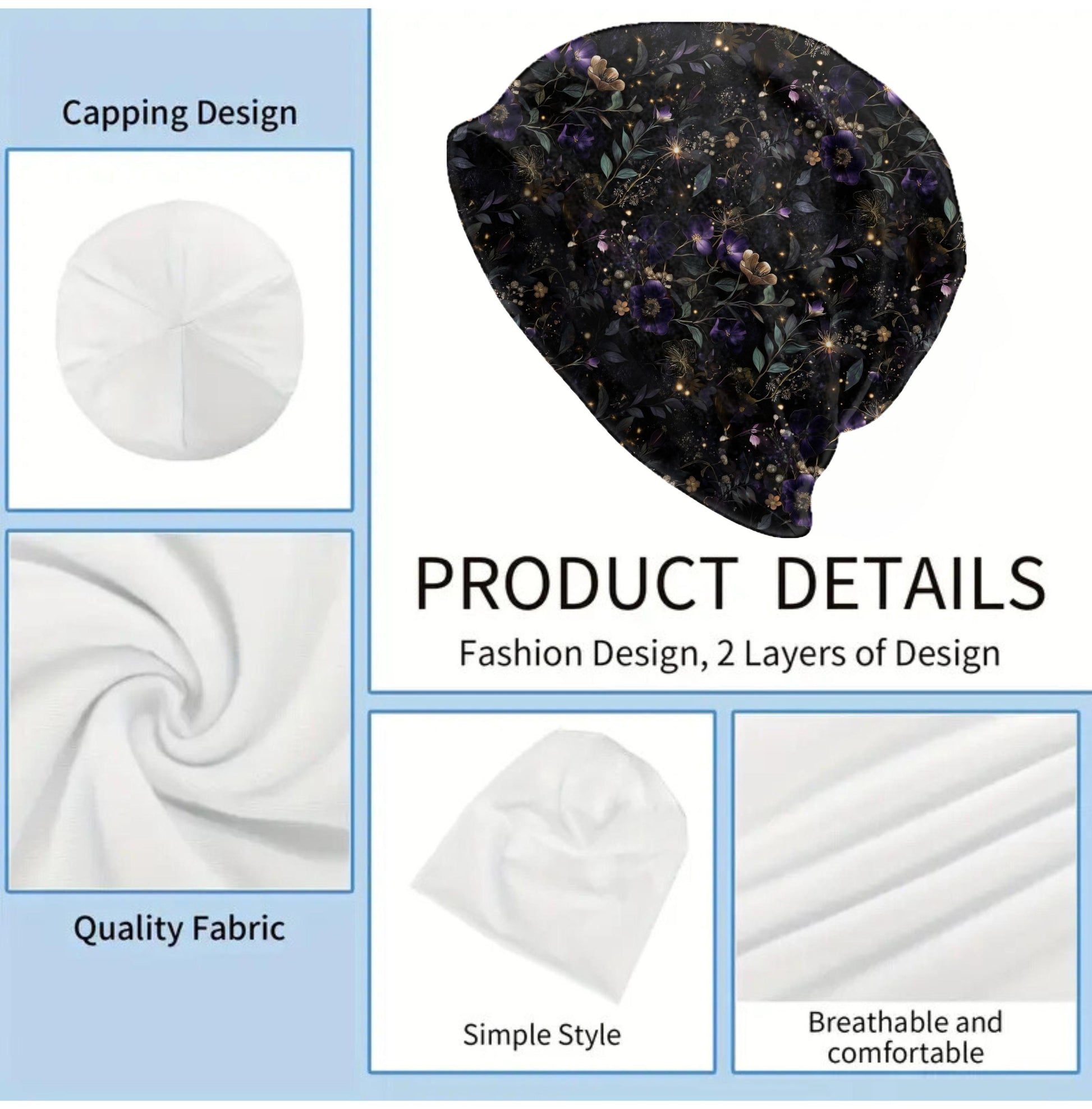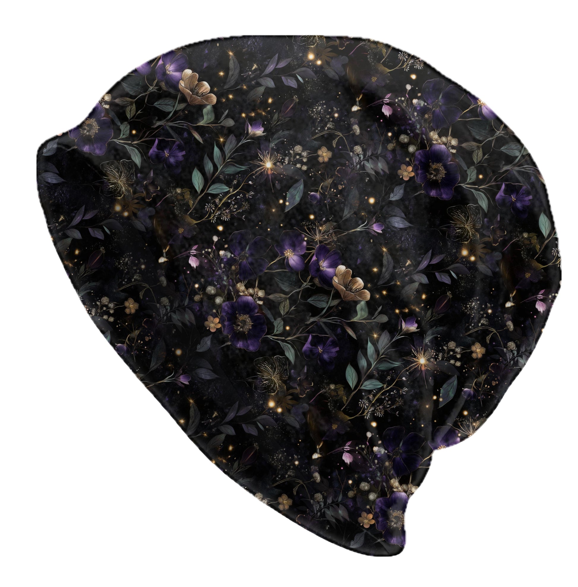 Dark Enchanted Slouchy Beanie – Midnight Floral Bonnet, Soft Thin Stretchy Skull Cap for Men & Women, Mystical Botanical Print Hat