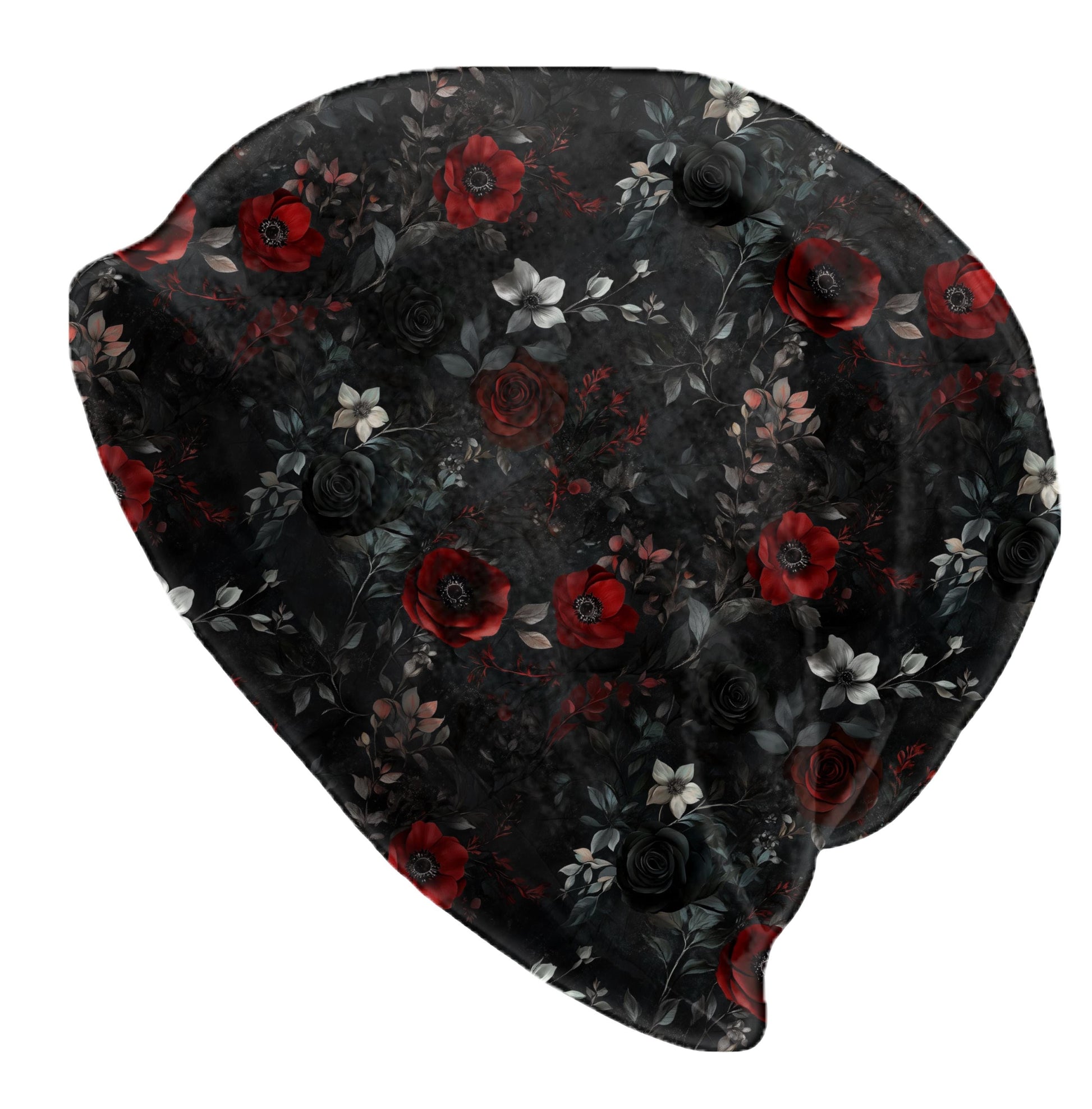Dark Romance Floral Slouchy Beanie – Gothic Rose Bonnet, Soft Thin Stretchy Skull Cap for Men and Women, Black & Red Botanical Print