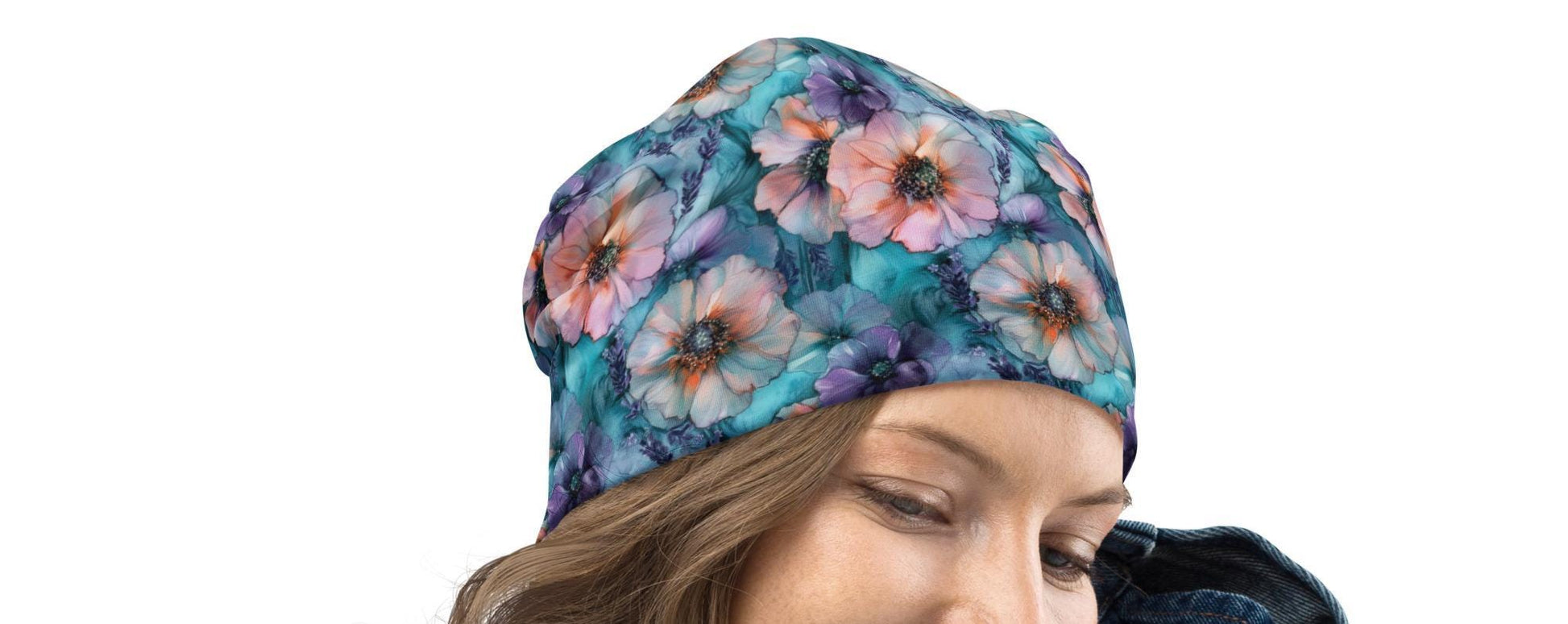 This beanie features a soft watercolor wildflower pattern with airy pastel blooms in peach, lavender, and dusty lilac layered over a teal meadow-wash background. Gentle golden tones and subtle botanical details give the artwork a dreamy, romantic feel inspired by misty gardens and early-morning wildflower fields.