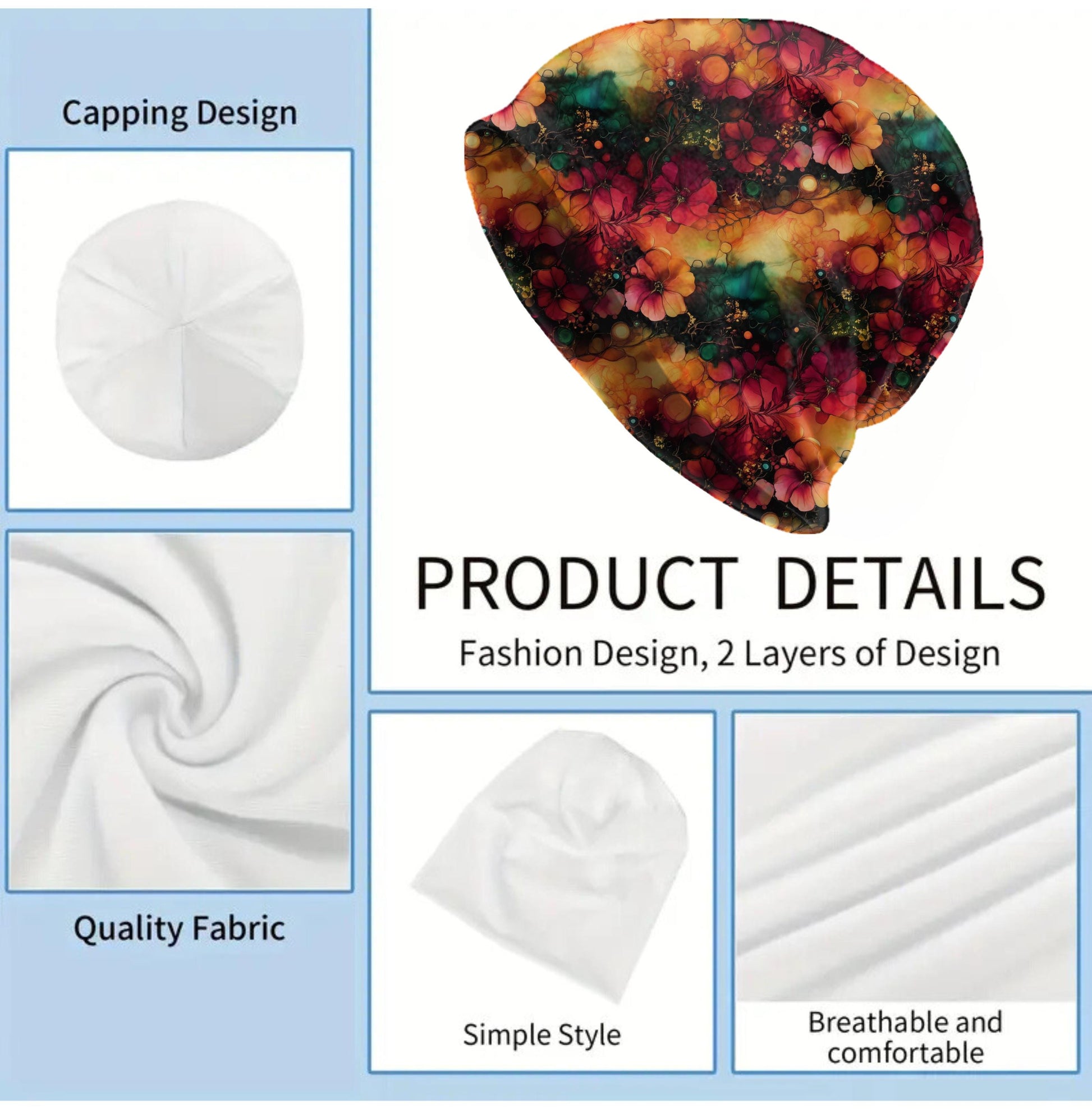 The hat is soft, lightweight, thin and stretchy, offering breathable comfort without bulk. It is not a thick or chunky knit beanie. Instead, it has a smooth, flexible drape suitable for year-round wear. The artwork is created with high-quality sublimation printing, permanently infused into the fabric so the colors will not peel or crack.