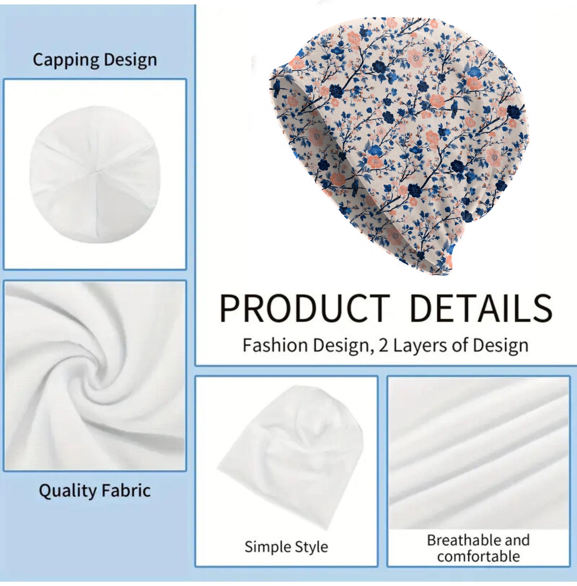 Indigo Blossom Slouchy Beanie – Thin Stretchy Lightweight Skull Cap for Men and Women in Navy and Peach Japanese Floral