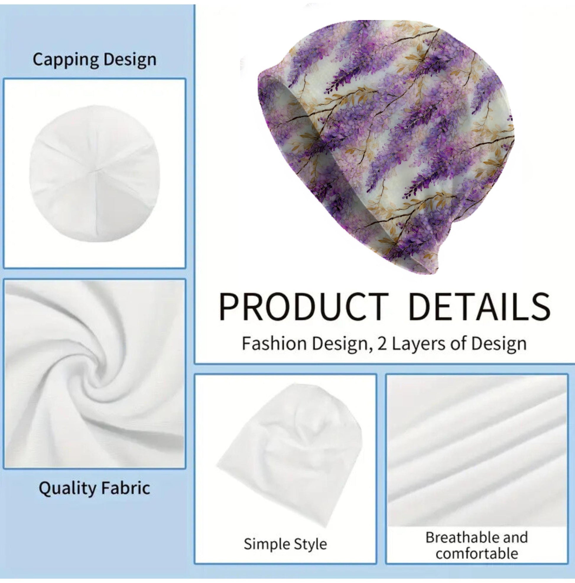 A lightweight unisex floral beanie with a flowing wisteria feel