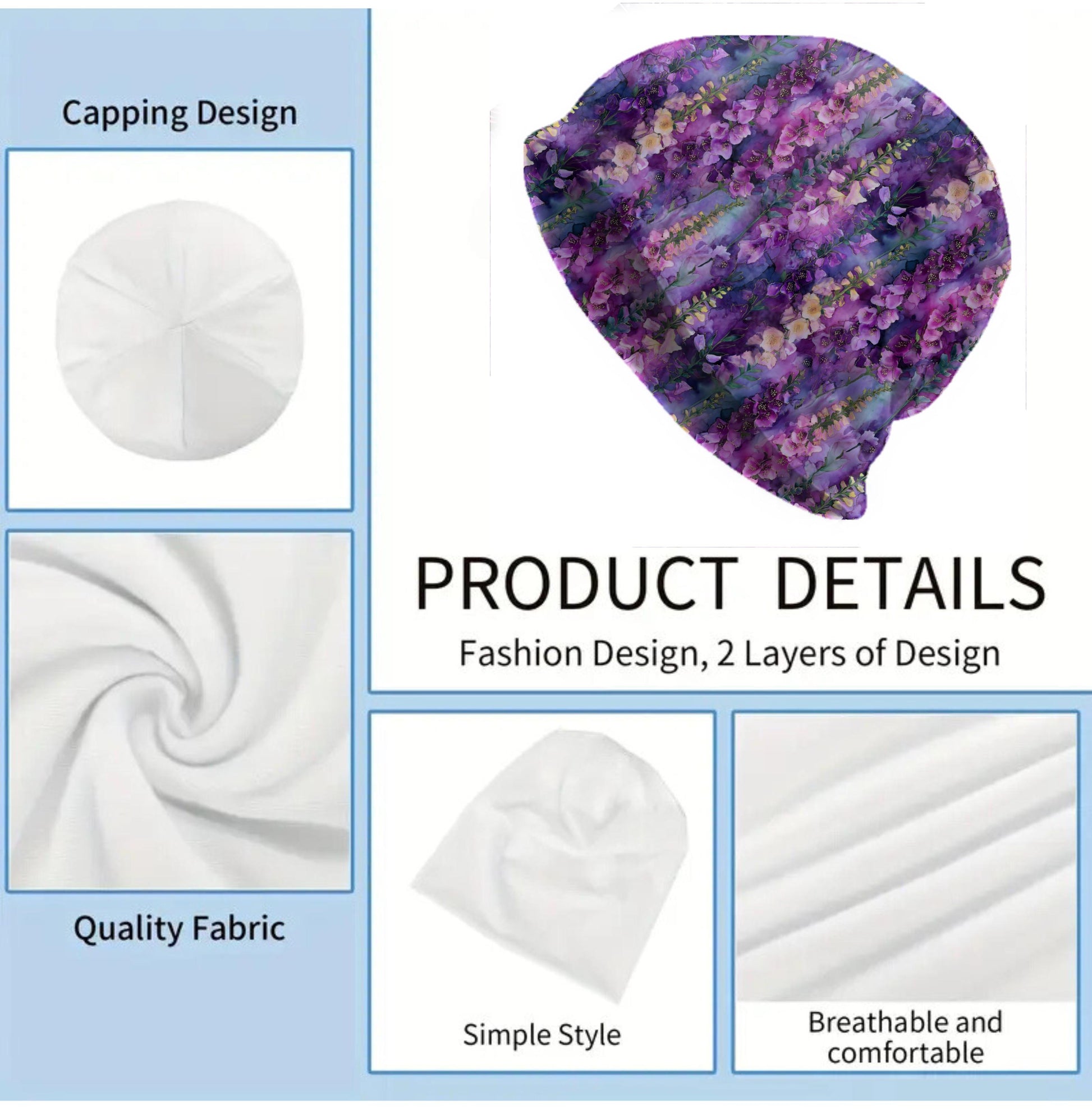 This beanie features tall foxglove blooms in layered shades of lilac, rose, plum, and violet, standing against a dreamy watercolor-style background. The petals glow with soft gradients and fine gold details, creating a lush, enchanted-garden look. It is a rich floral pattern perfect for anyone who loves purple botanicals.