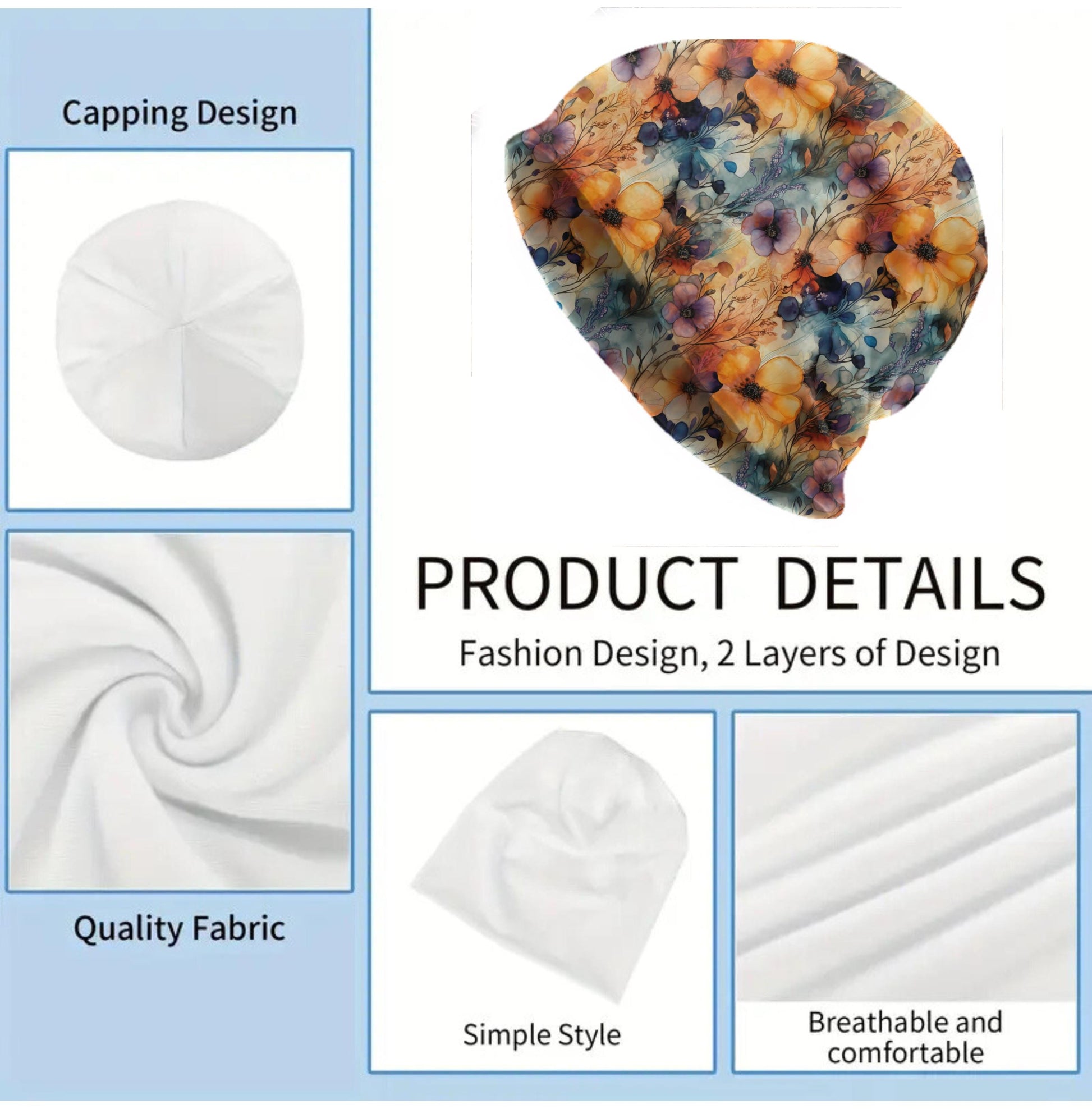 This beanie blooms with warm orange petals, soft lavender tones, deep navy shadows, and airy watercolor botanicals. The print blends sunlight hues with cool blue leafy silhouettes, creating a dreamy painted-garden look. Gentle gradients and flowing ink-style details give the pattern a soft, artistic atmosphere.