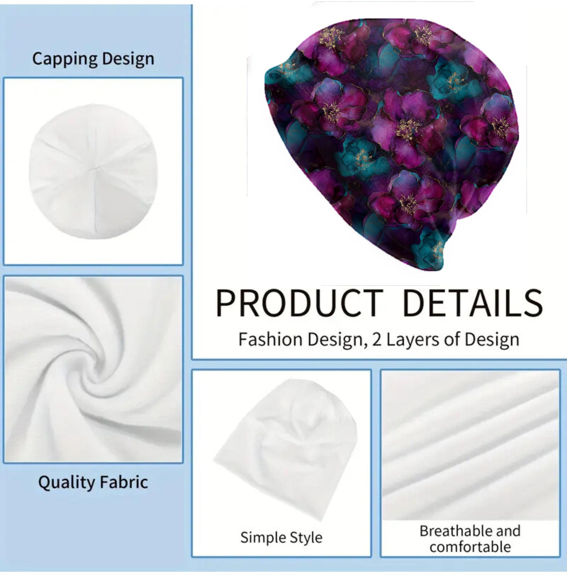 Magenta Fusion Slouchy Beanie – Thin Stretchy Lightweight Skull Cap for Men & Women, Soft Ink Floral Bonnet in Teal Purple Gold