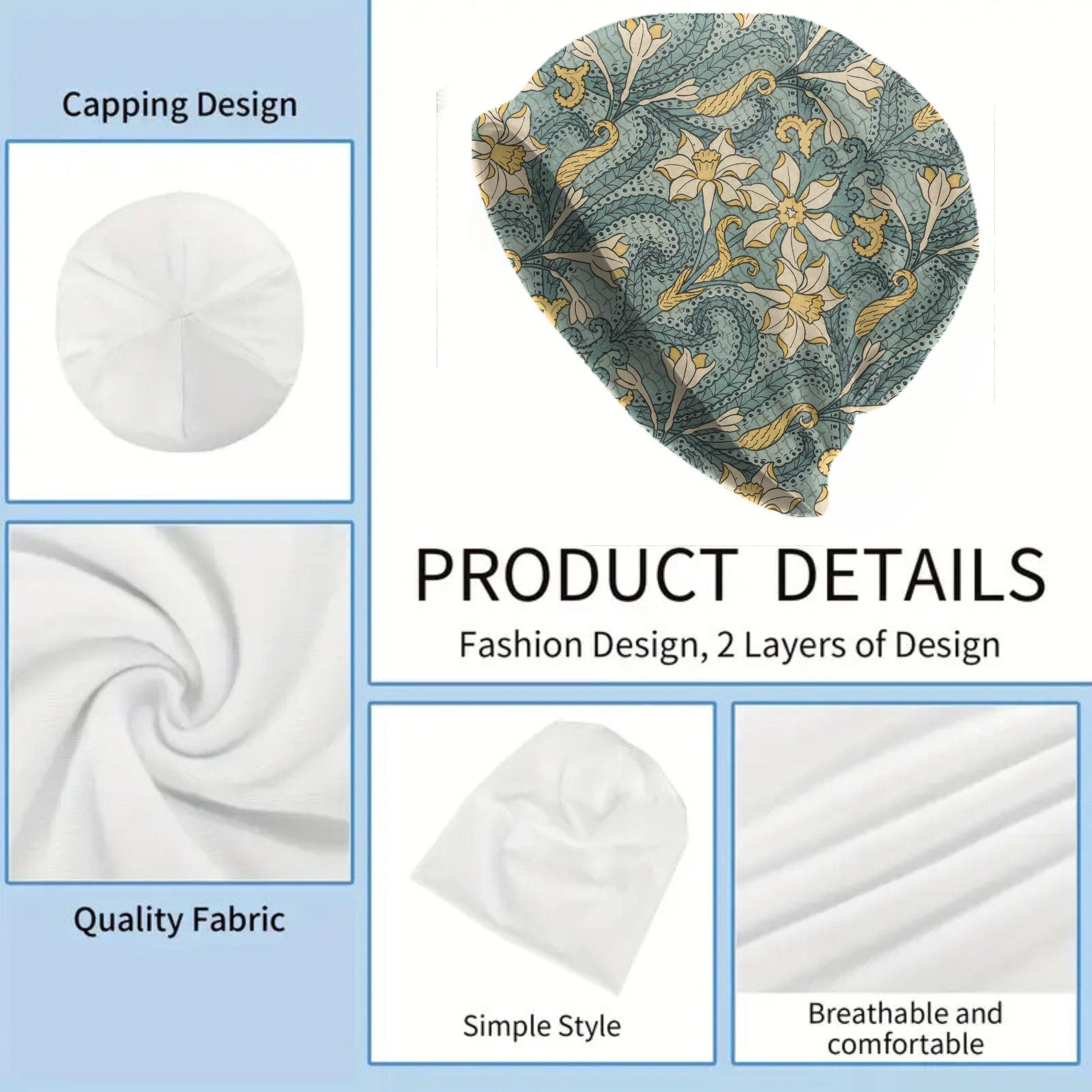 Bring elegant Art Nouveau charm to your wardrobe with this Maurice Pillard “Jonquil” floral beanie. Featuring delicate jonquil blooms and swirling botanical vines in soft teal and golden tones, this vintage-inspired hat adds poetic style to any outfit.