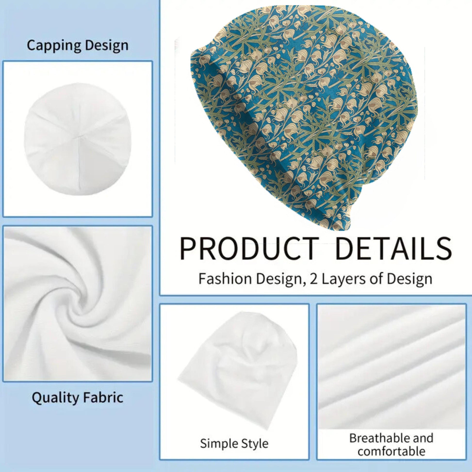 Maurice Pillard Monk’s Hood Beanie – Art Nouveau Blue Floral Slouch Hat, Vintage Botanical Cap, Soft Lightweight Beanie