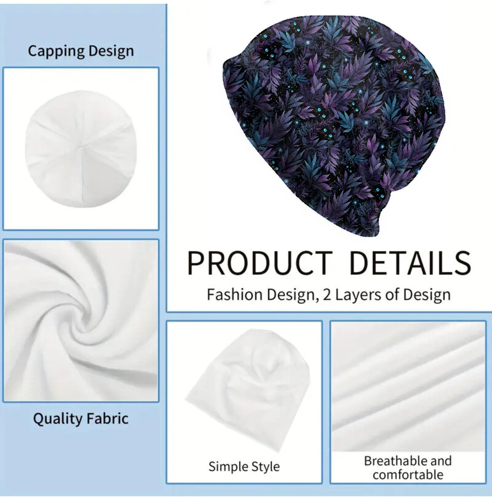This midnight cat foliage slouchy beanie features deep purples, icy blues, and layered botanical textures with hidden black cats peeking through the leaves. Their glowing blue eyes create a mysterious and playful nighttime atmosphere, perfect for anyone who loves moody, whimsical designs.
