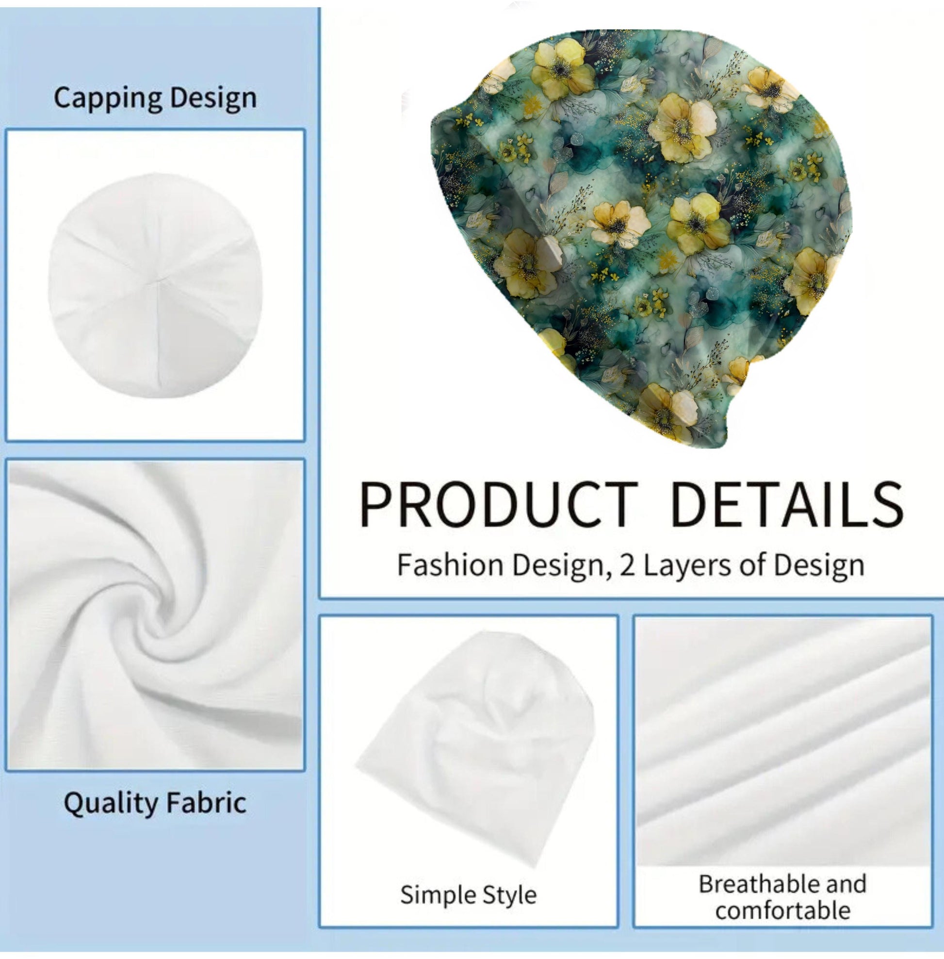 Misty Wildflower Slouchy Beanie – Thin Stretchy Lightweight Skull Cap for Men & Women in Soft Teal and Yellow Florals