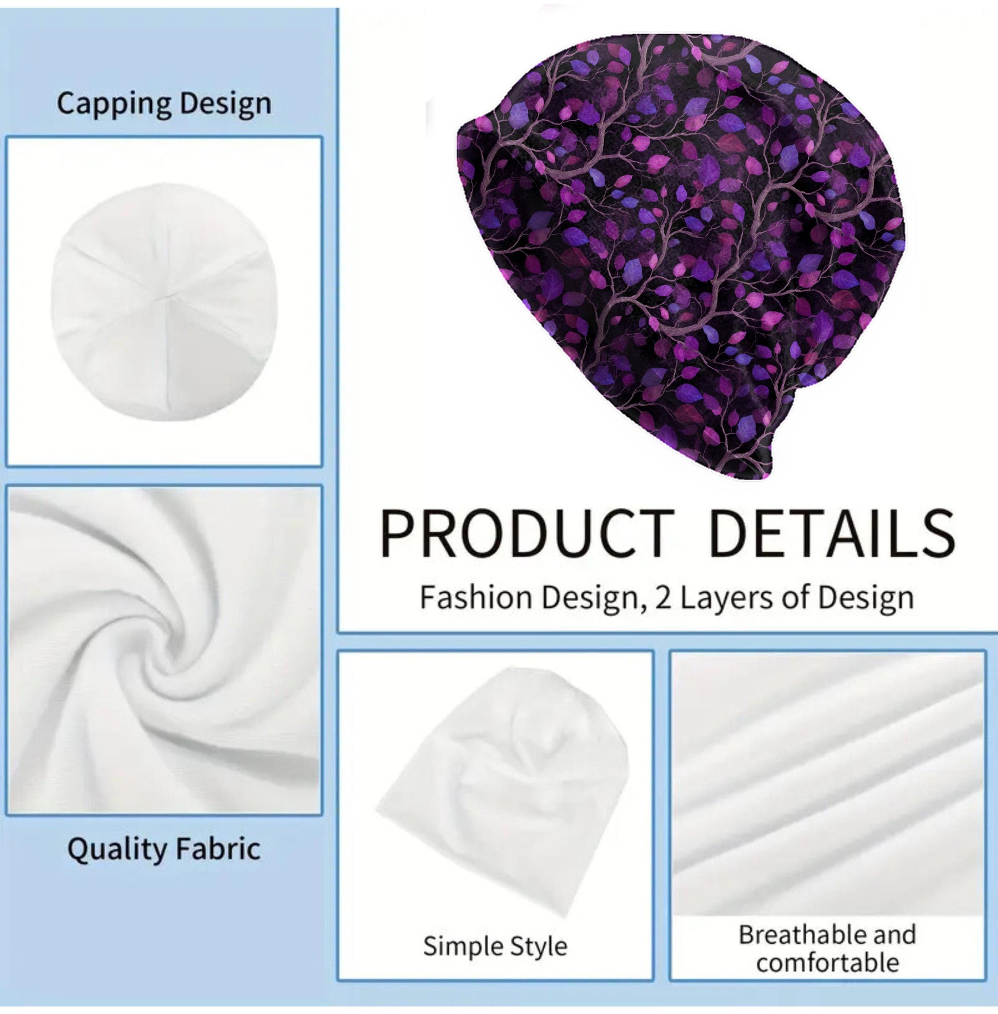 Purple Forest Leaves Slouchy Beanie – Soft Lightweight Skull Cap, Thin Bonnet Hat for Men & Women, Night Woodland Leaf Pattern
