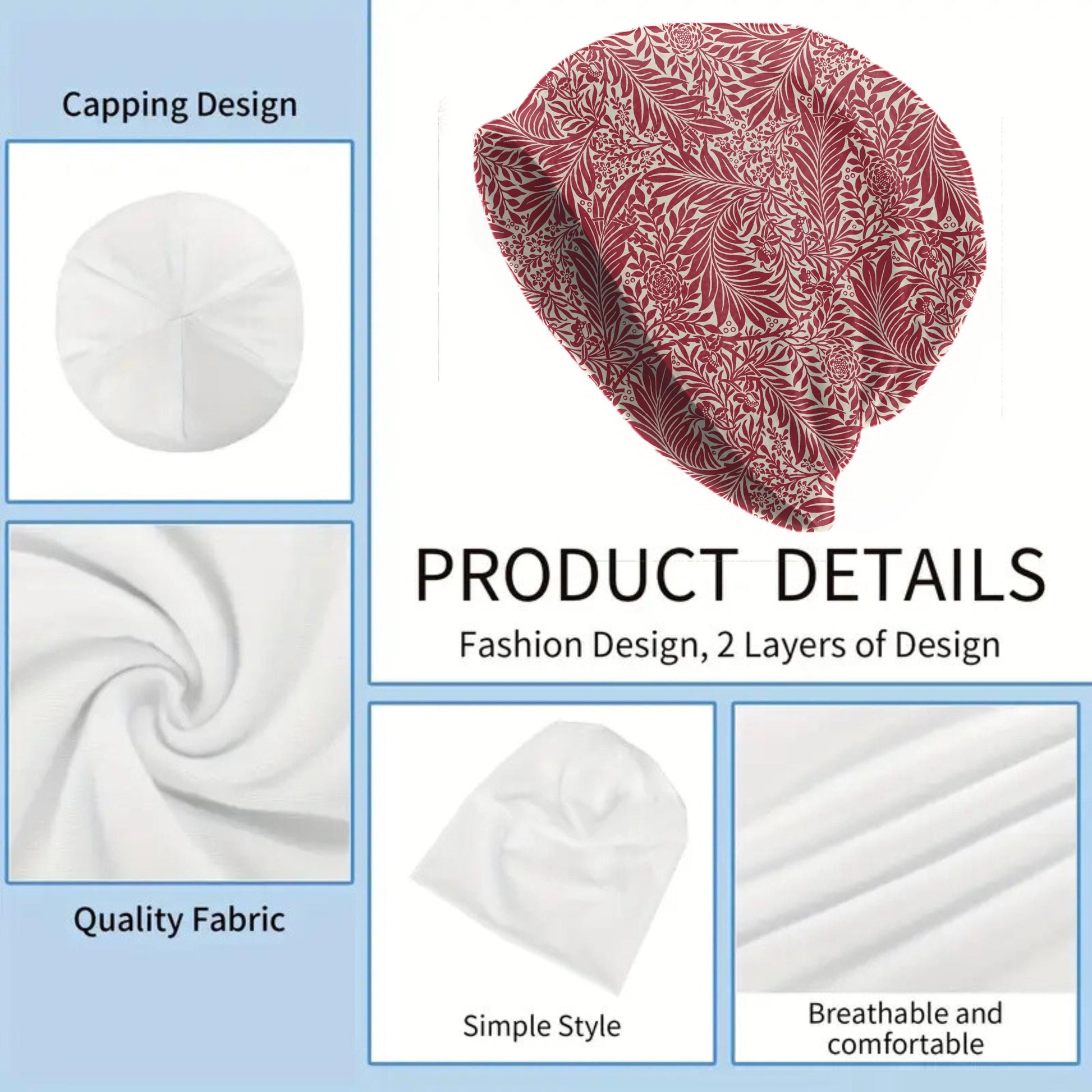 Queen Anne William Morris Beanie – Vintage Red Floral & Bird Slouch Hat, Soft Stretch Cap, Heritage Pattern, Women’s Hat & Men’s Beanie