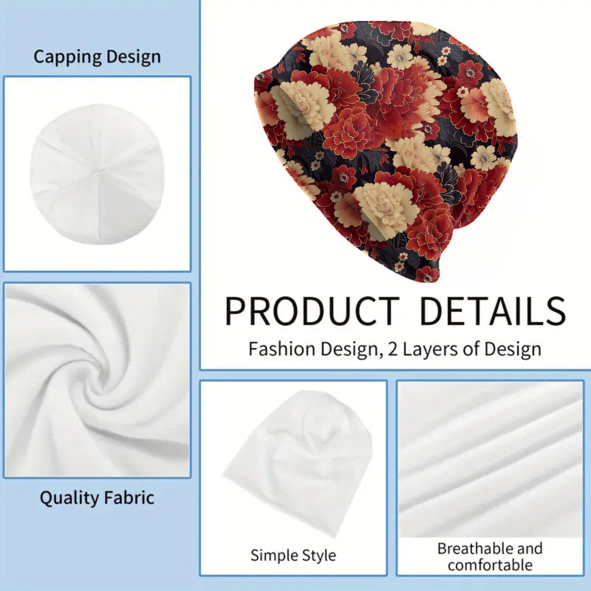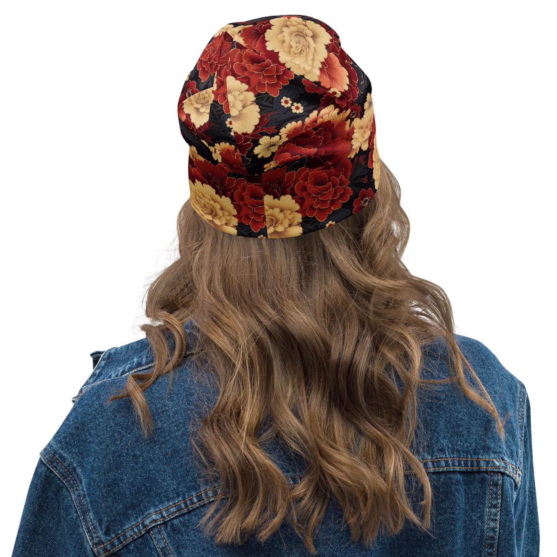 Elegant, bold, and timeless — this Red & Cream Peony Beanie features a richly layered floral pattern inspired by vintage Asian textiles. The design blends deep crimson, soft ivory, and navy accents to create a striking balance of warmth and sophistication. Perfect for fall and winter, it pairs effortlessly with both casual and dressy looks.