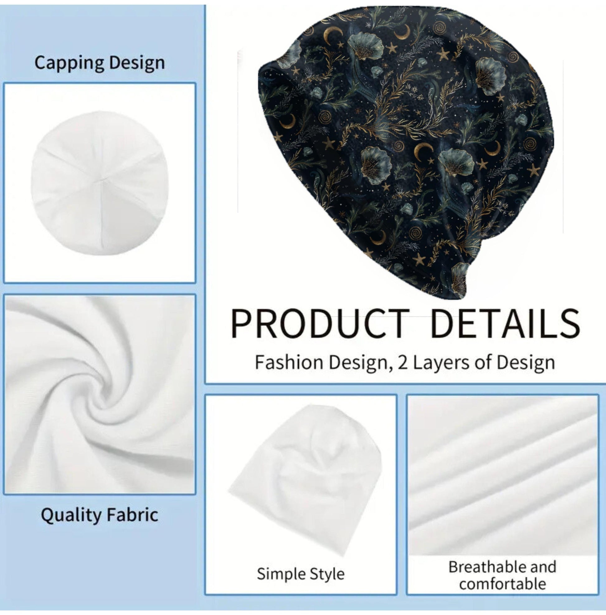 Sea Witch Nightfall Slouchy Beanie – Dark Botanical Ocean Bonnet, Soft Thin Double-Layer Skull Cap for Men & Women, Mystic Nautical Print
