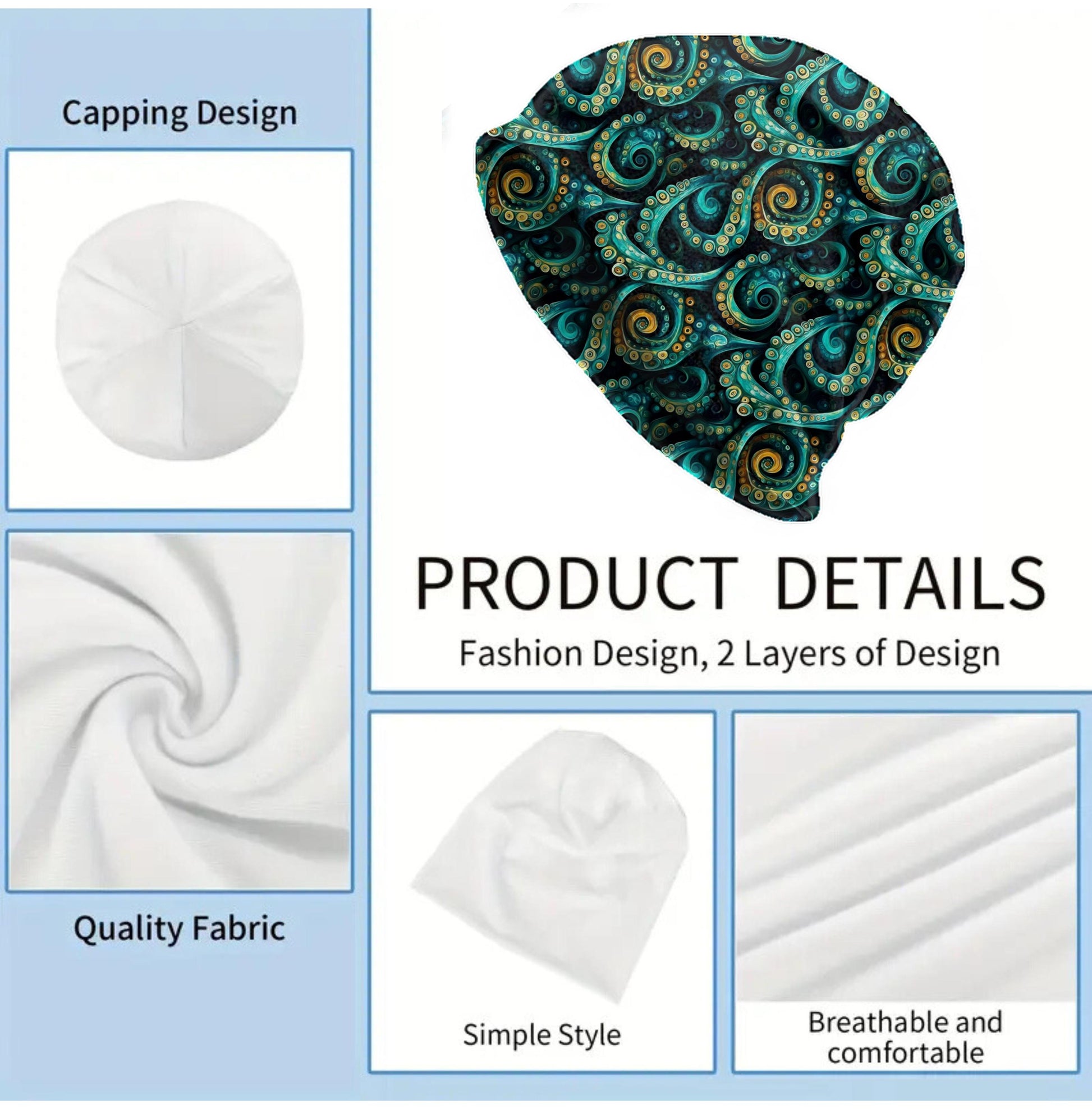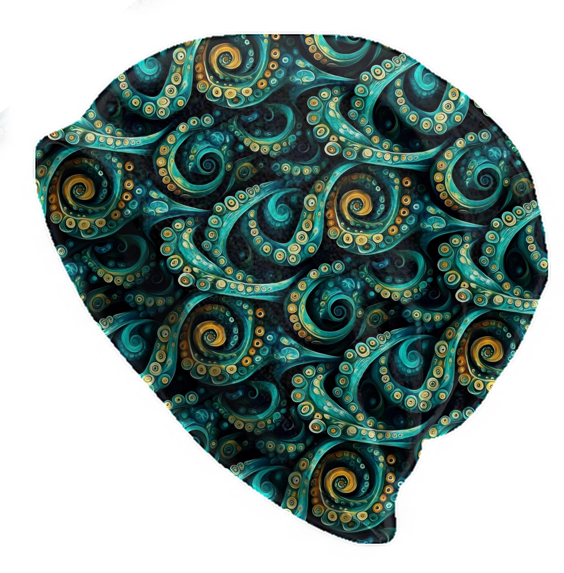 Teal Tentacle Slouchy Beanie – Thin Stretchy Lightweight Skull Cap for Men and Women in Ocean Swirl Pattern