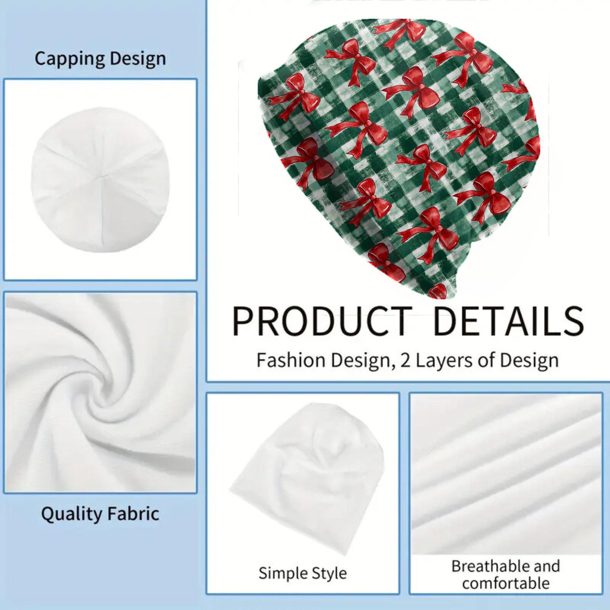 Add a touch of cozy holiday charm with this green gingham Christmas bow beanie! The repeating red ribbon pattern gives it a festive, playful look perfect for family gatherings, Christmas markets, seasonal photos, or everyday winter wear.