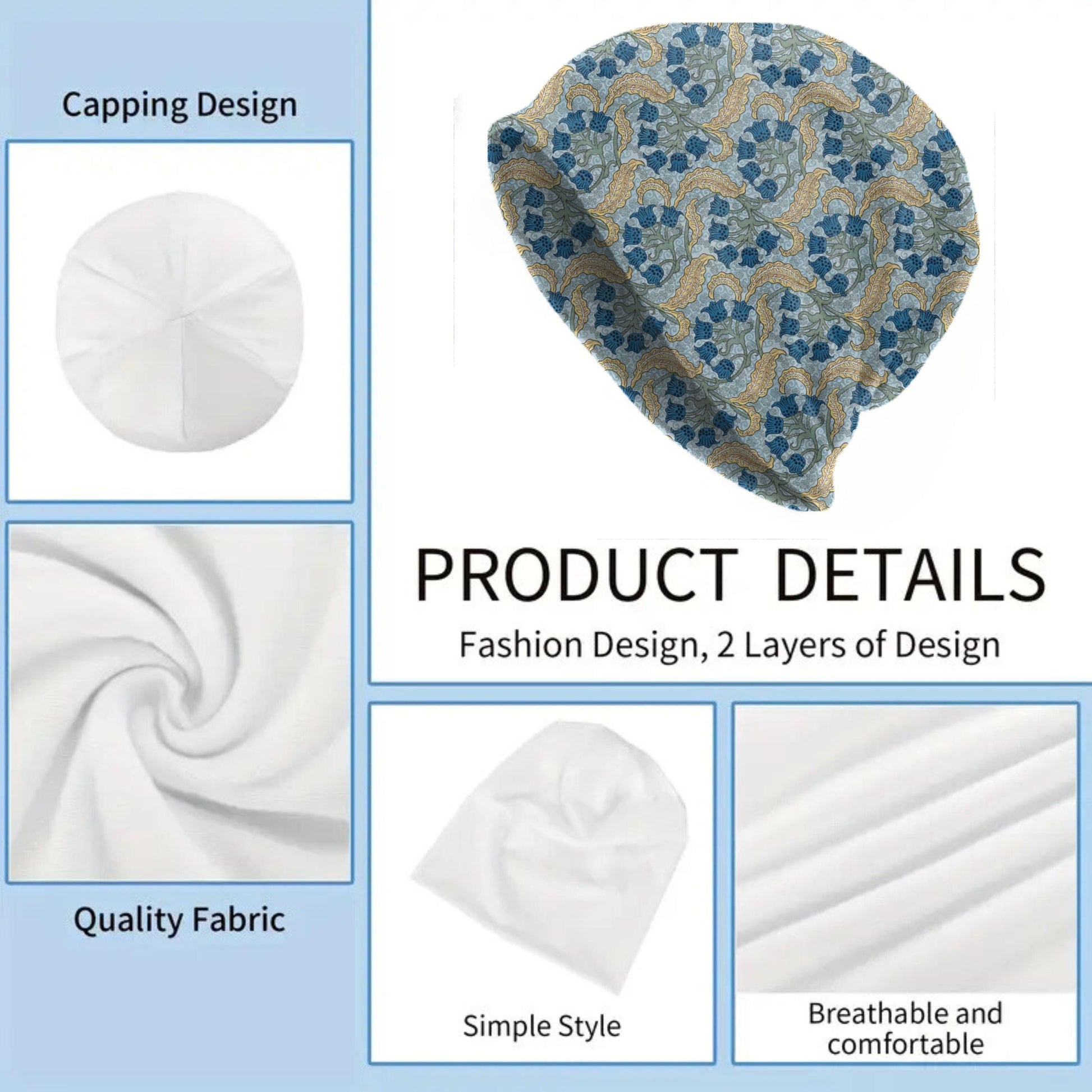 Thin Maurice Pillard Lily of the Valley Beanie – Art Nouveau Blue Floral Slouch Hat, Vintage Botanical Cap, Soft Lightweight Beanie