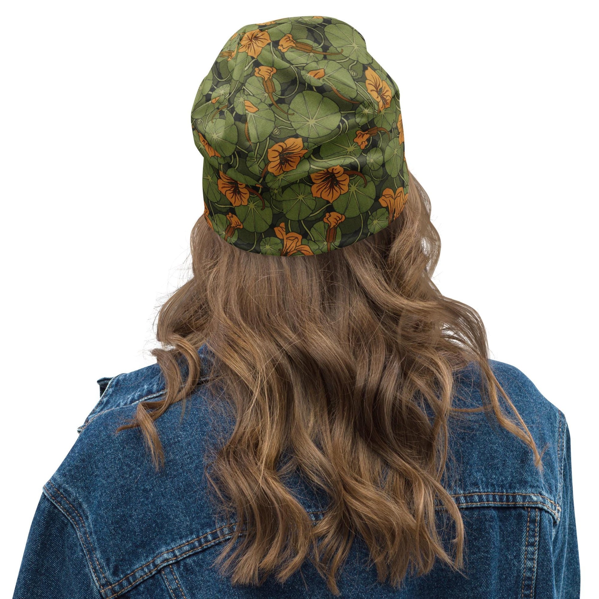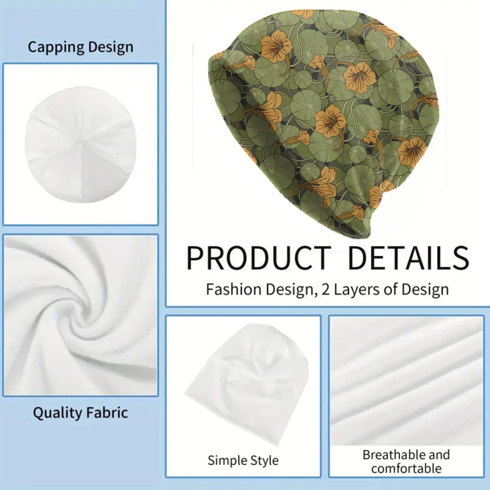Thin Maurice Pillard Nasturtium Beanie – Art Nouveau Green Floral Slouch Hat, Vintage Botanical Cap, Lightweight Soft Beanie