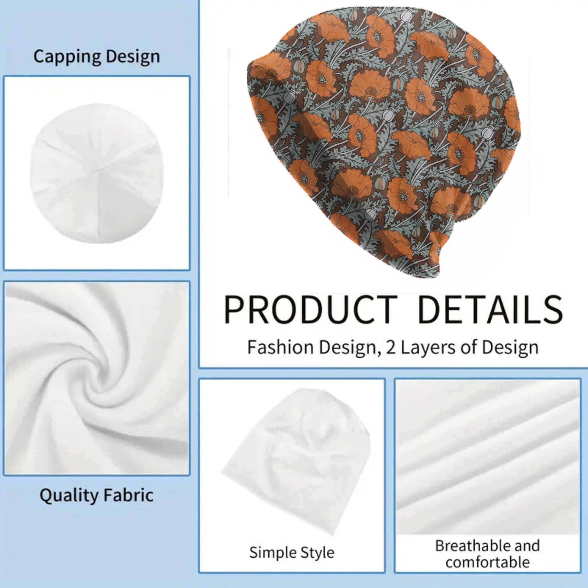 Maurice Pillard Poppies Beanie – Vintage Art Nouveau Floral Hat, Terracotta Botanical Slouch Cap, Soft Lightweight Beanie, Order Size Up for Slouch Fit