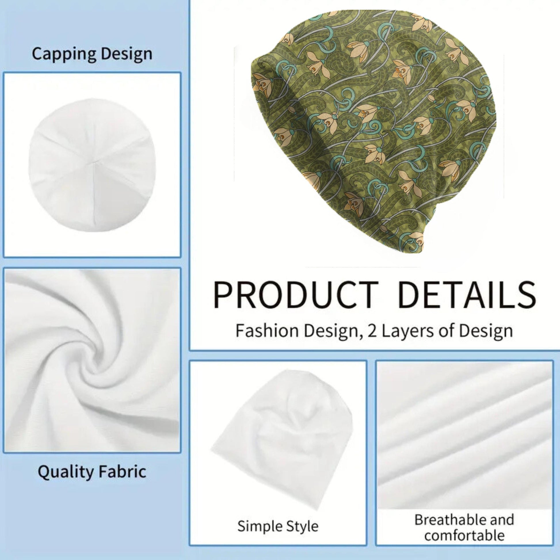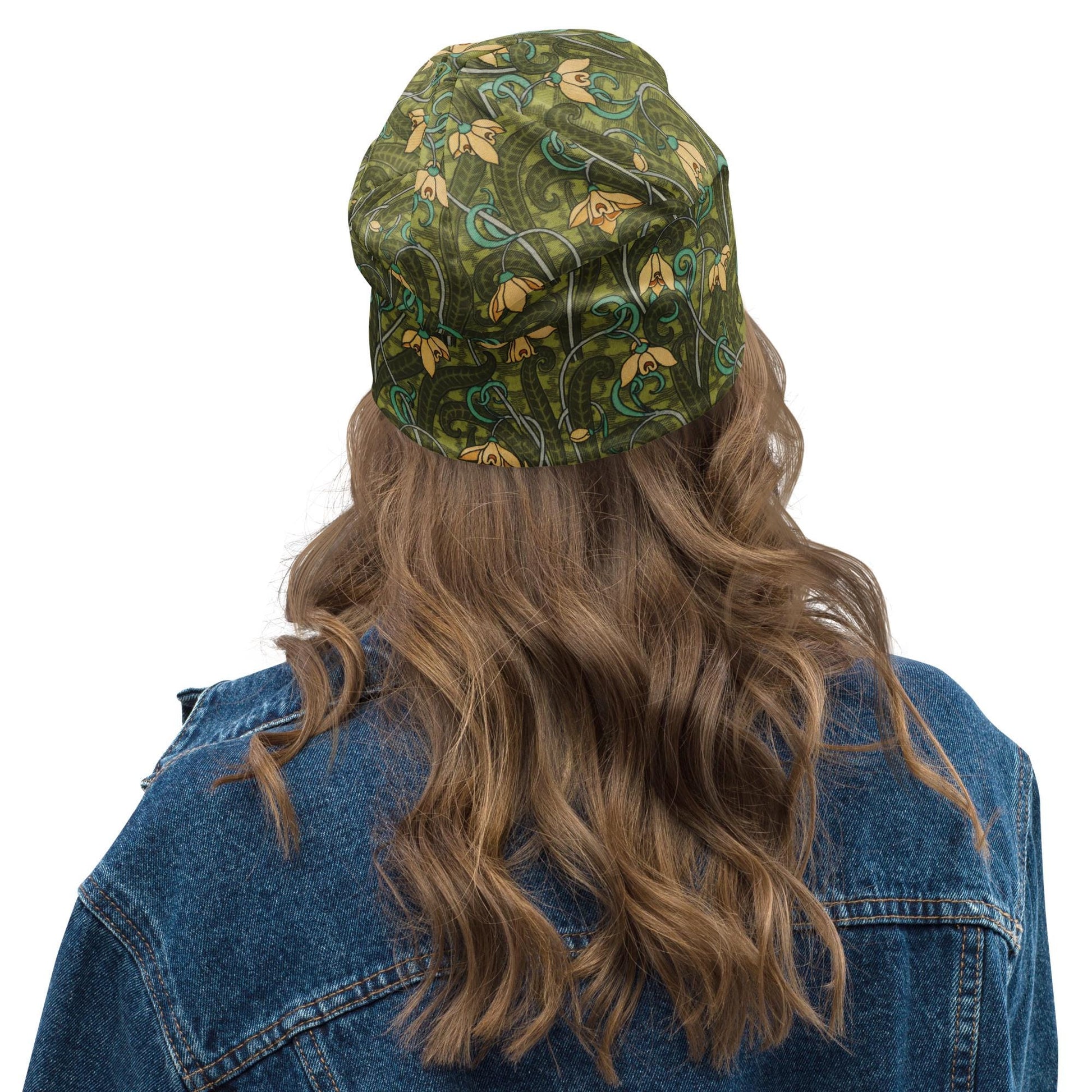 Delicate snowdrops meet flowing Art Nouveau vines in this Maurice Pillard Snowdrop beanie. Featuring soft cream flowers, cool teal accents, and olive botanical scrolls, this lightweight hat brings a serene, vintage garden feel to any outfit.