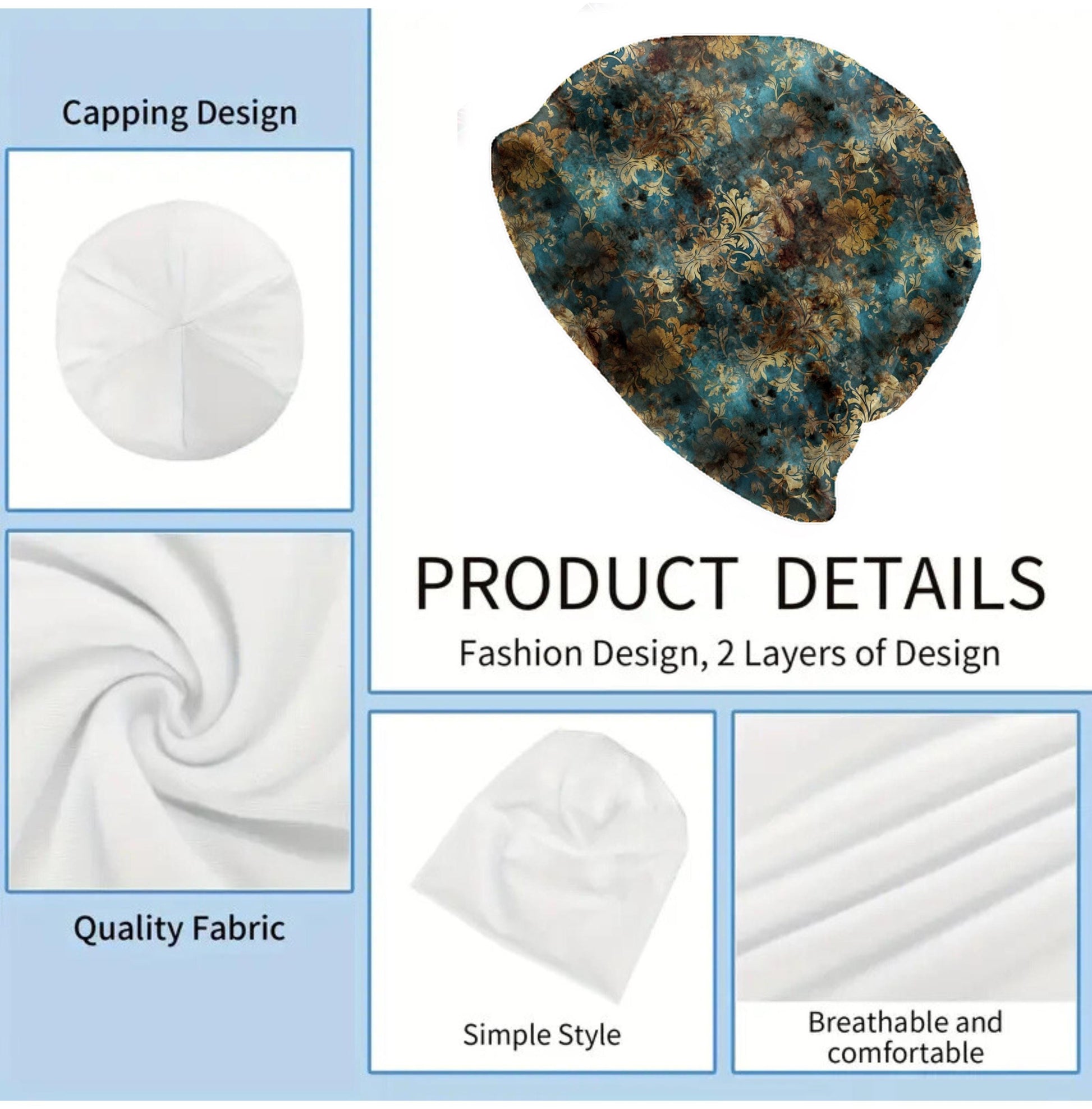 Vintage Teal Baroque Slouchy Beanie – Thin Stretchy Lightweight Skull Cap for Men and Women in Gold Damask Pattern