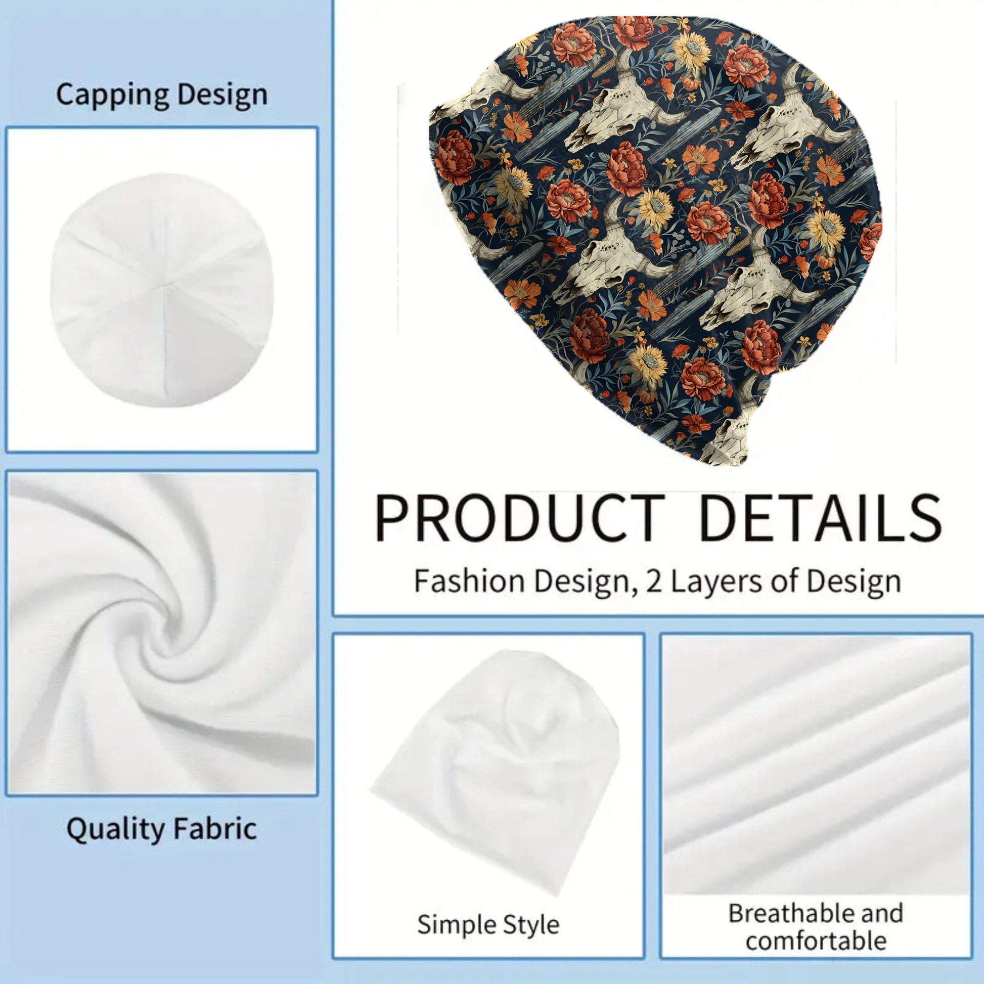 Western Floral Skull Beanie – Thin Soft Slouchy Hat for Men, Womens beanie – Boho Cow Skull & Desert Bloom Print, Beanie For Men