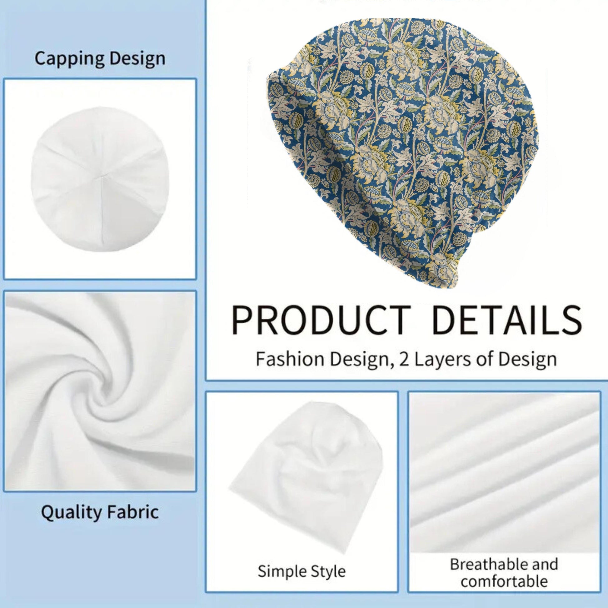 William Morris Blue Chrysanthemum Sunflower Beanie – Vintage Gold Floral Botanical Slouchy Hat – Thin Women’s Hat & Men’s Beanie